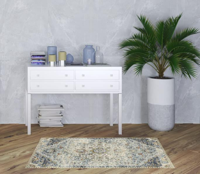 3' X 5' Blue Beige Rust Gold And Teal Oriental Power Loom Stain Resistant Area Rug