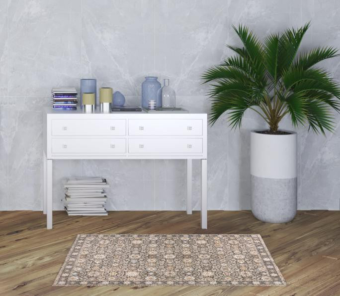 3' X 5' Grey And Ivory Oriental Power Loom Stain Resistant Area Rug With Fringe