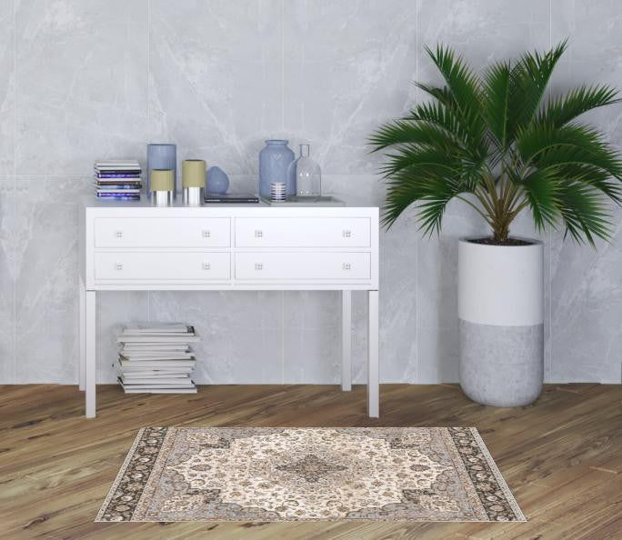 3' X 5' Ivory And Blue Oriental Power Loom Stain Resistant Area Rug With Fringe