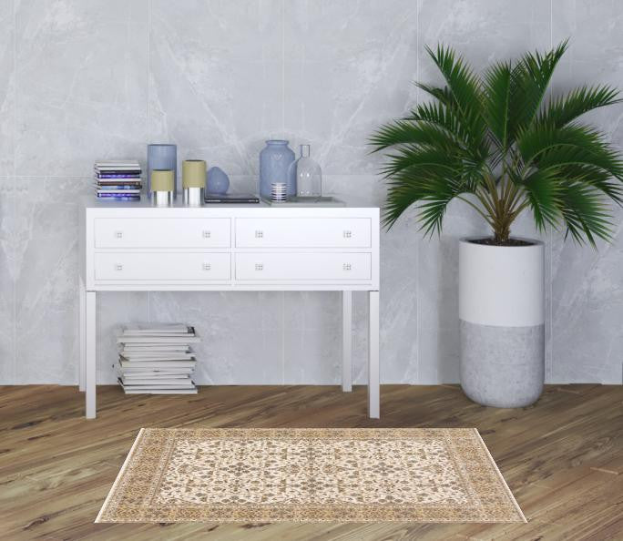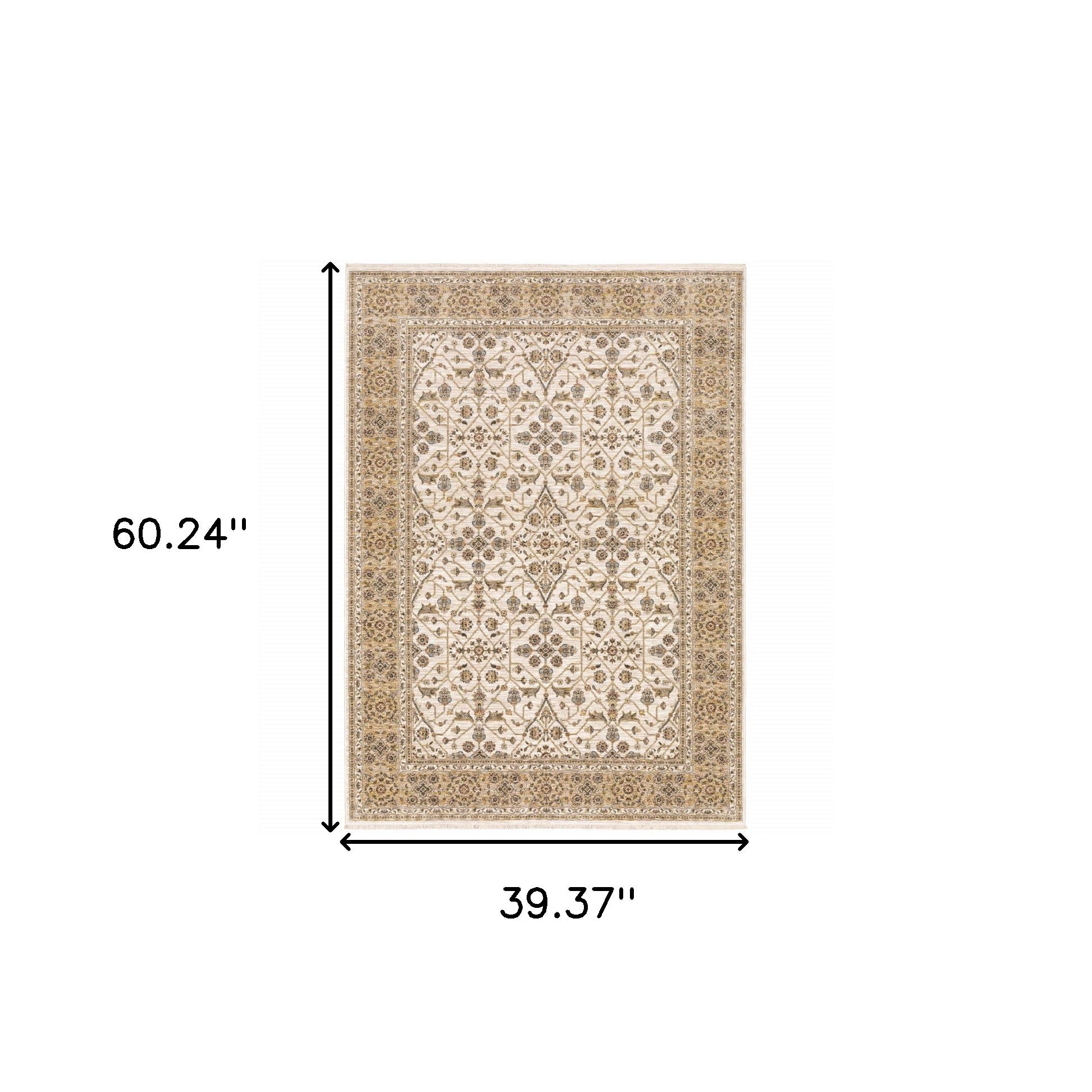 3' X 5' Ivory And Gold Oriental Power Loom Stain Resistant Area Rug With Fringe