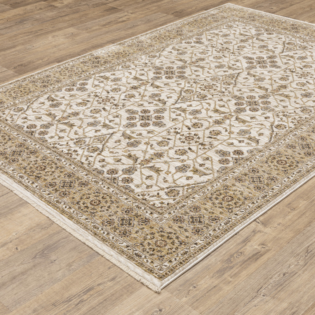 This 3' x 5' ivory and gold oriental power loom stain resistant area rug with fringe, is a great way to add warmth to a room. This rectangle shaped rug features a oriental design in ivory and gold to give it visual interest. A classic shape marries with good looking design for your space Ideal for spaces with kids and pets, this rug is stain resistant to help repel stains and spilled liquids. Tassel ends bring a timeless and fashionable look to your interior. Area Rugs help to give warmth and sense of home to your space. 0.23" H x 39.37" W x 60.24" D