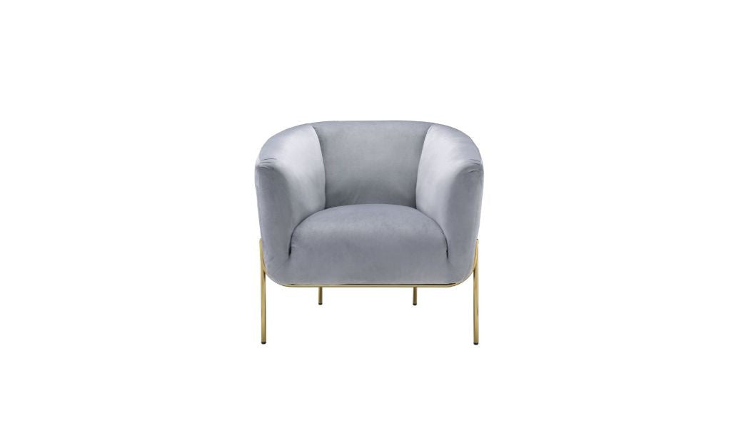 Unique and decorative, this 30" gray velvet and gold solid color barrel chair will leave a lasting impression. This gorgeous solid color gray barrel chair is masterfully upholstered in durable velvet. Giving the chair stability and structure, the inner frame is constructed with high quality manufactured wood, includes comfy armrests, and features a tight back that comes complete with soft and comfortable cushioning. The tufted cushions add fine designer detailing. 29" H x 30" W x 28" D