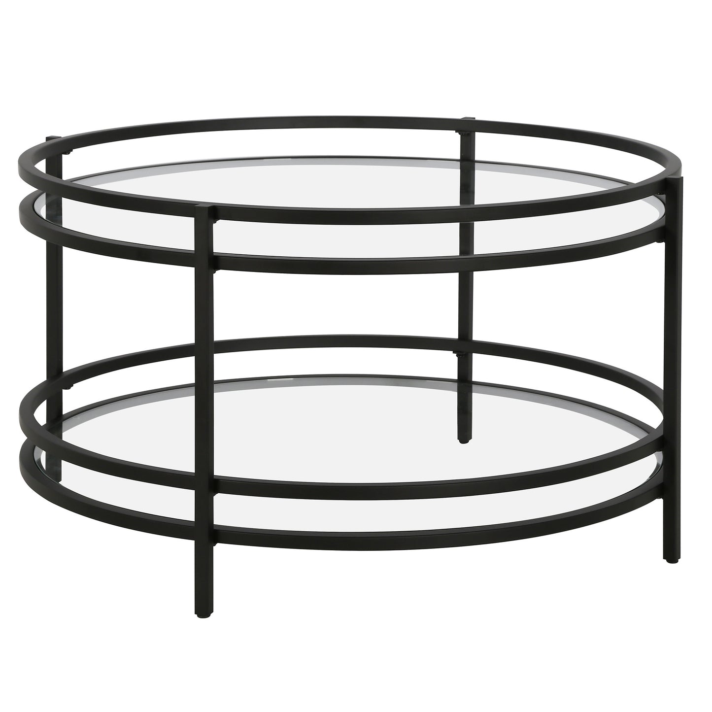 This good looking 32-inch black glass and steel round coffee table with shelf is sure to inspire compliments no matter where it sits. This table features an updated monotone color scheme with black as the main color on both the glass top and the steel base. Help to keep your space organized with the included single shelf. This round table features a fresh and stylish shape to give your room a visually pleasing accent. If you're looking for something that can fit into a living area, bedroom, or office, this coffee table is for you. This coffee table is the sturdy, reliable and stylish answer to your living room needs. 18-inch H x 32-inch W x 32-inch D