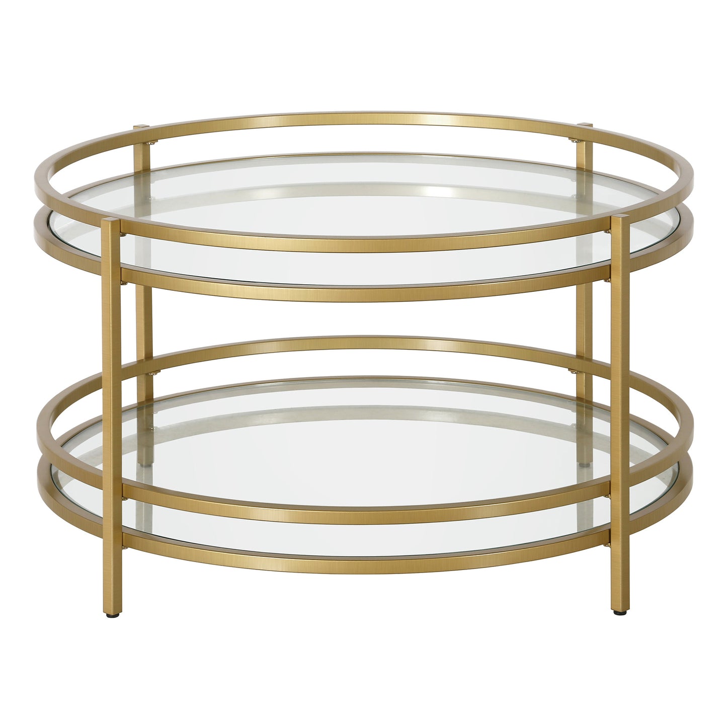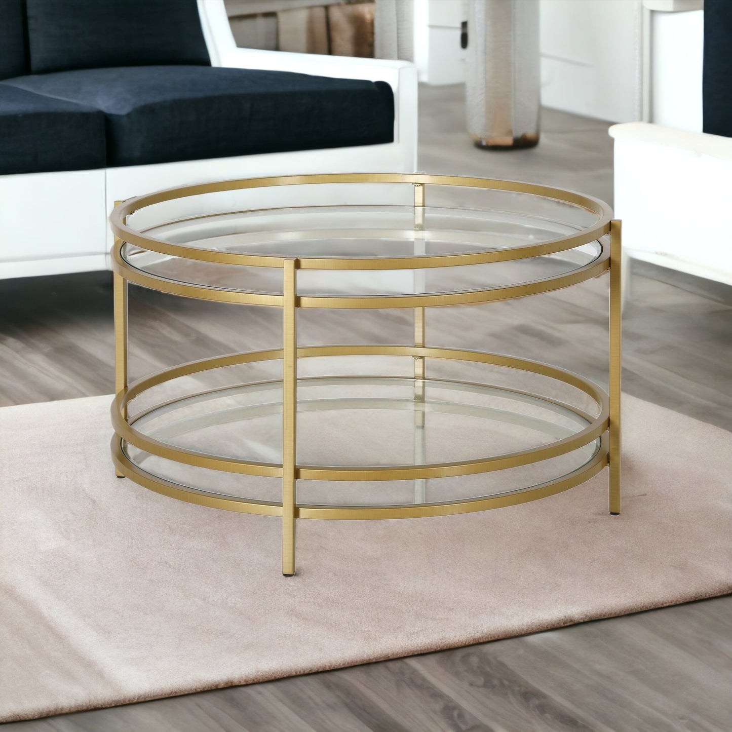 32" Gold Glass And Steel Round Coffee Table With Shelf