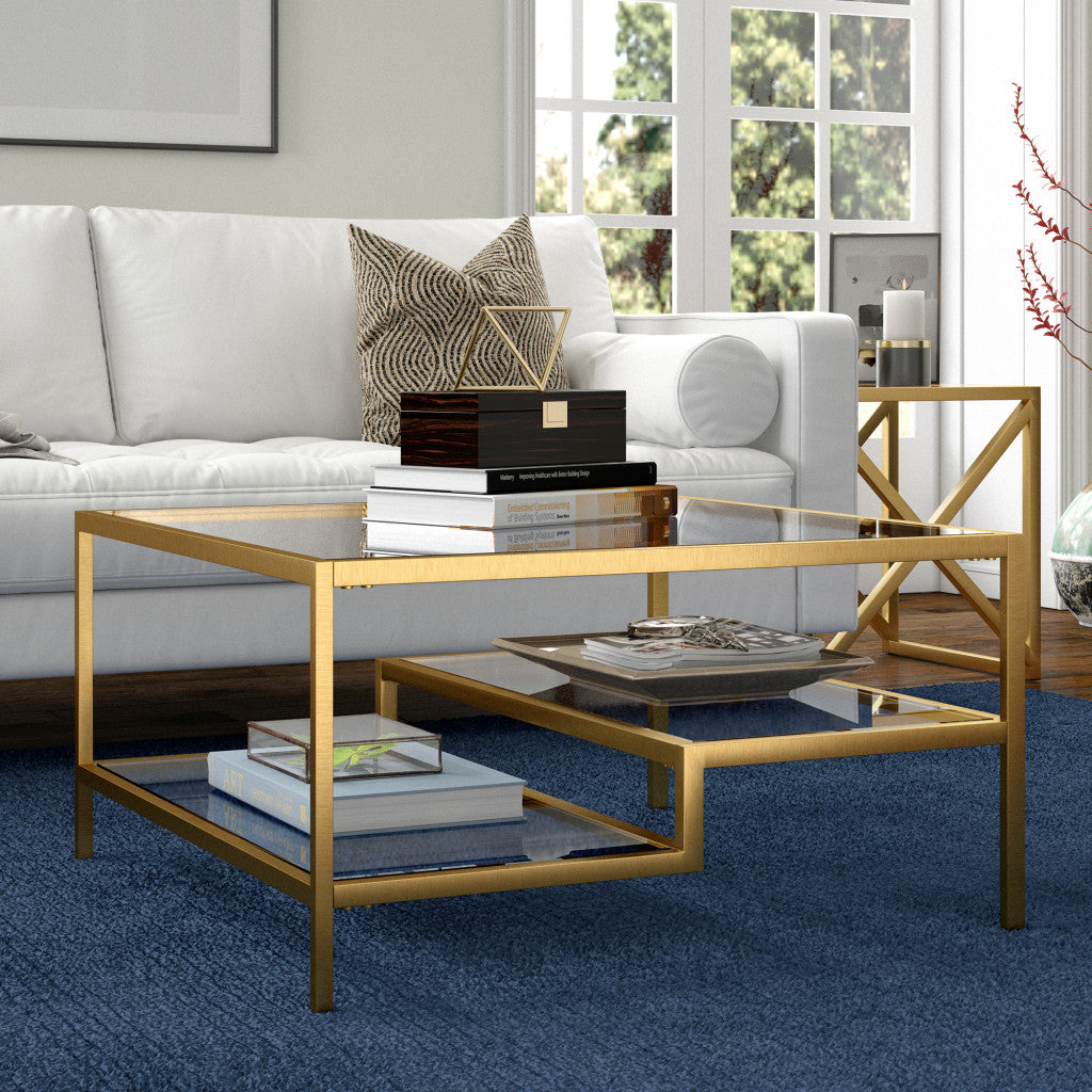 32" Gold Glass And Steel Square Coffee Table With Two Shelves