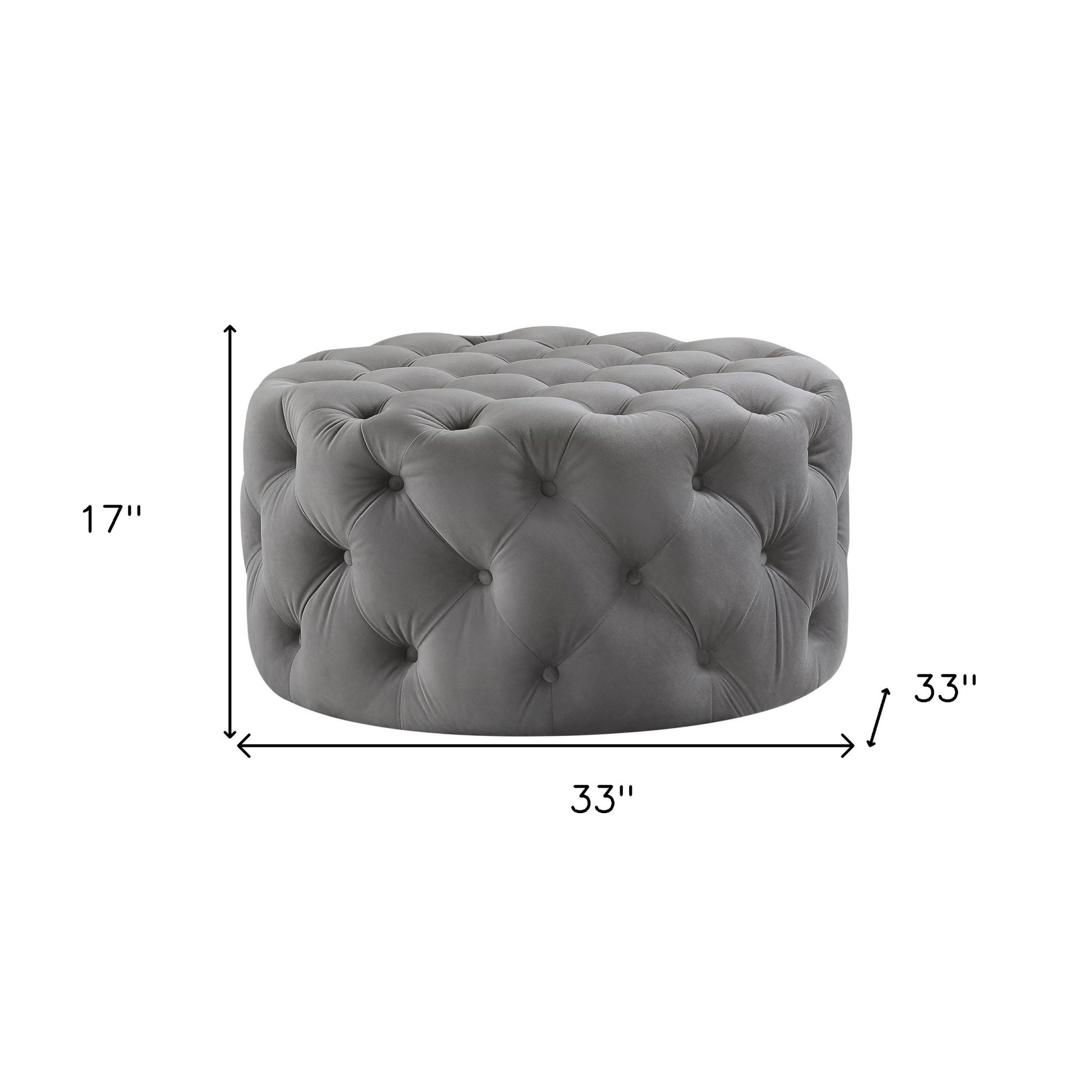 Optimize your space and add some charm to your room with the 33" blush velvet and black rolling tufted round cocktail ottoman. This chic cocktail ottoman is larger in size and designed to serve as a make-shift coffee table during parties. The surface is wide and flat which is not only suitable for a footrest or seat but also ready to hold trays of appetizers, drinks, or desserts. The blush upholstery top of this ottoman is a nice contrast to the high quality, black solid wood of the base. Expertly upholstered with padding in a soft solid color velvet, this ottoman is as comfortable as it is good looking. Easy to blend into most any room, a ottoman is a way to add a good looking accent to your space that can also be practical and useful. . 17" H x 33" W x 33" D