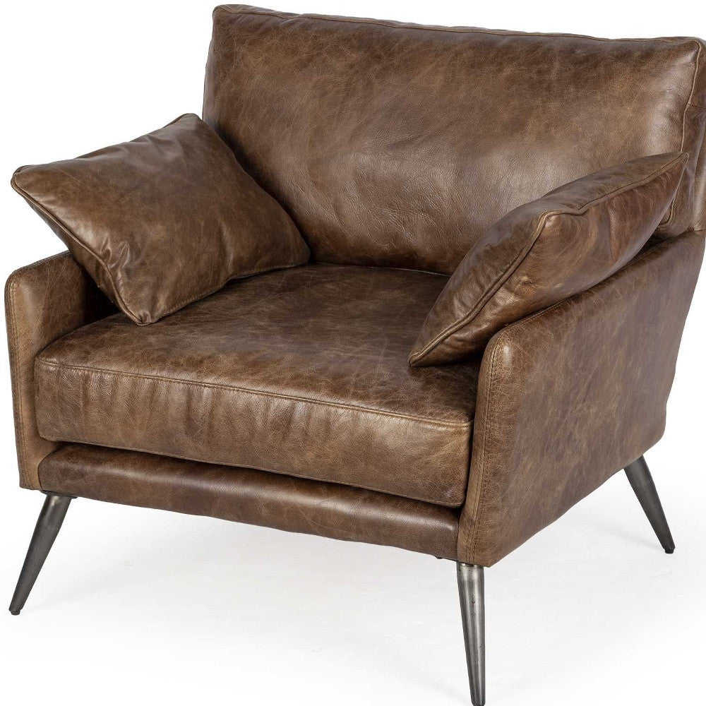 This 33" brown and silver faux leather distressed arm chair is the perfect decorative yet functional accessory for your home. Built to last this arm chair is finished in brown faux leather to give your room a great update. The sturdy inner frame is built with high quality solid wood, includes armrests, and features a cushion back that is accented with soft and comfortable cushioning. 32.5" H x 33" W x 34.5" D
