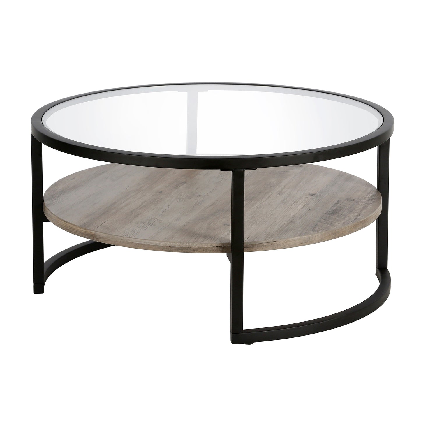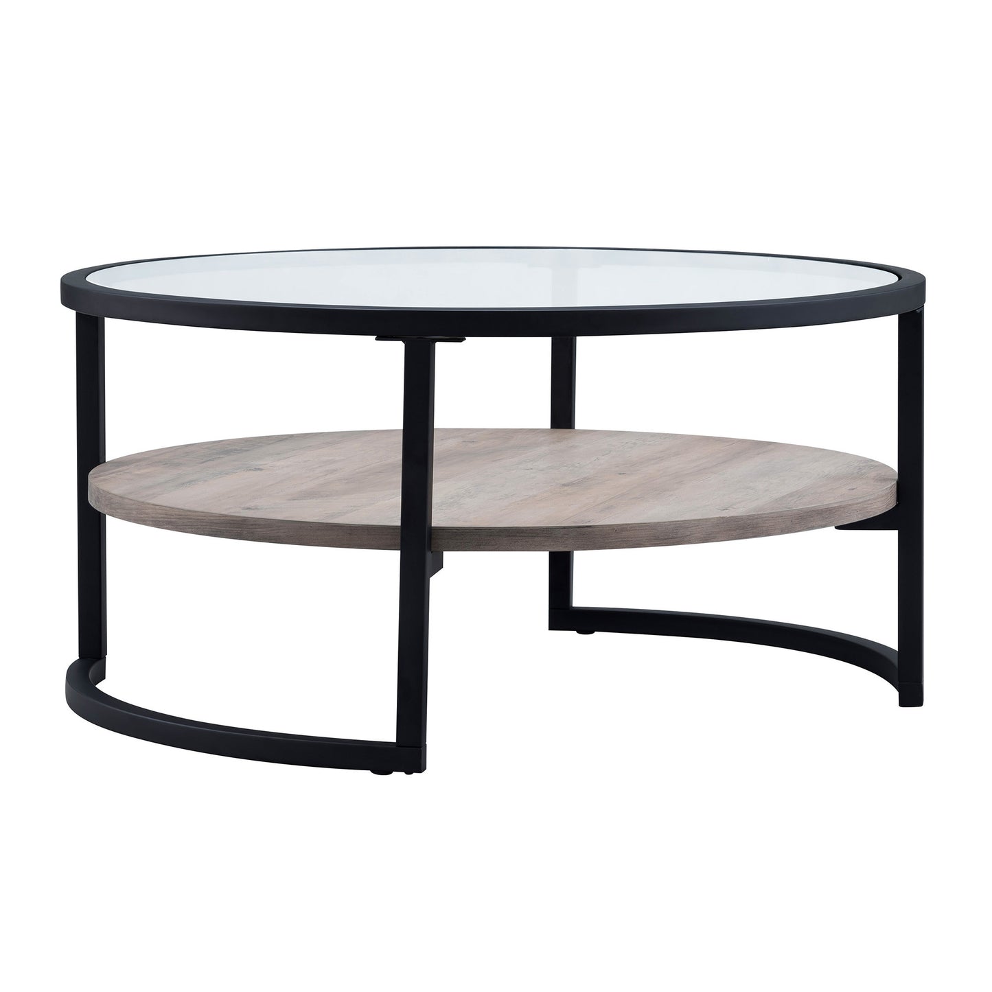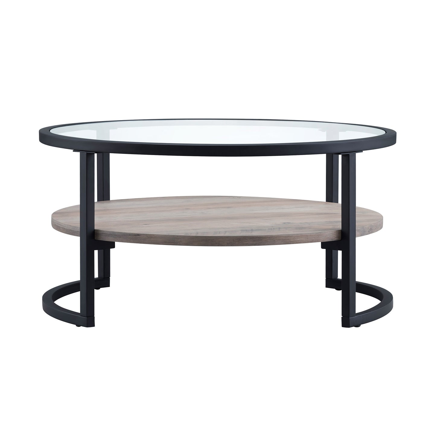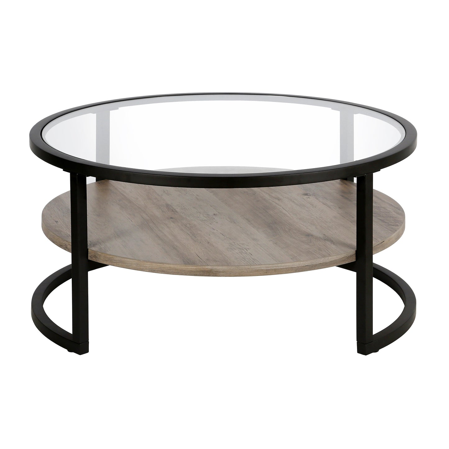 This good looking 34-inch black glass and steel round coffee table with shelf is not only practical, but good looking and built to last. A sleek black monotone color gives this steel and glass table a fresh and updated look. Help to keep your space organized with the included single shelf. This round table features a fresh and stylish shape to give your room a visually pleasing accent. It has a fresh design that will definitely breathe some fresh air into your interior. This coffee table is the sturdy, reliable and stylish answer to your living room needs. 17-inch H x 34-inch W x 34-inch D