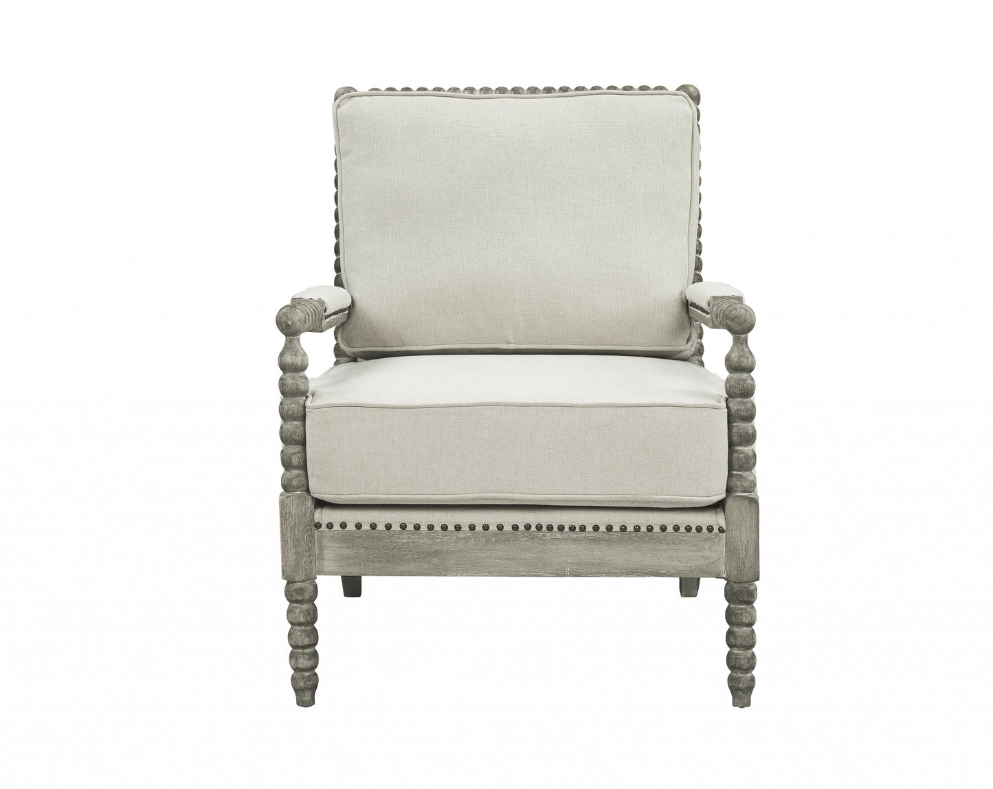 Unique and decorative, this 35" beige linen and gray oak solid color club chair will leave a lasting impression. This sturdy linen upholstered club chair comes in a chic solid beige color to give your space just the right look. Giving the chair stability and structure, the inner frame is constructed with high quality solid + manufactured wood, includes comfy armrests, and features a loose back that comes complete with soft and comfortable cushioning. This chair includes high end detailing such as nailhead trim to wow you and your guests. 39" H x 35" W x 28" D