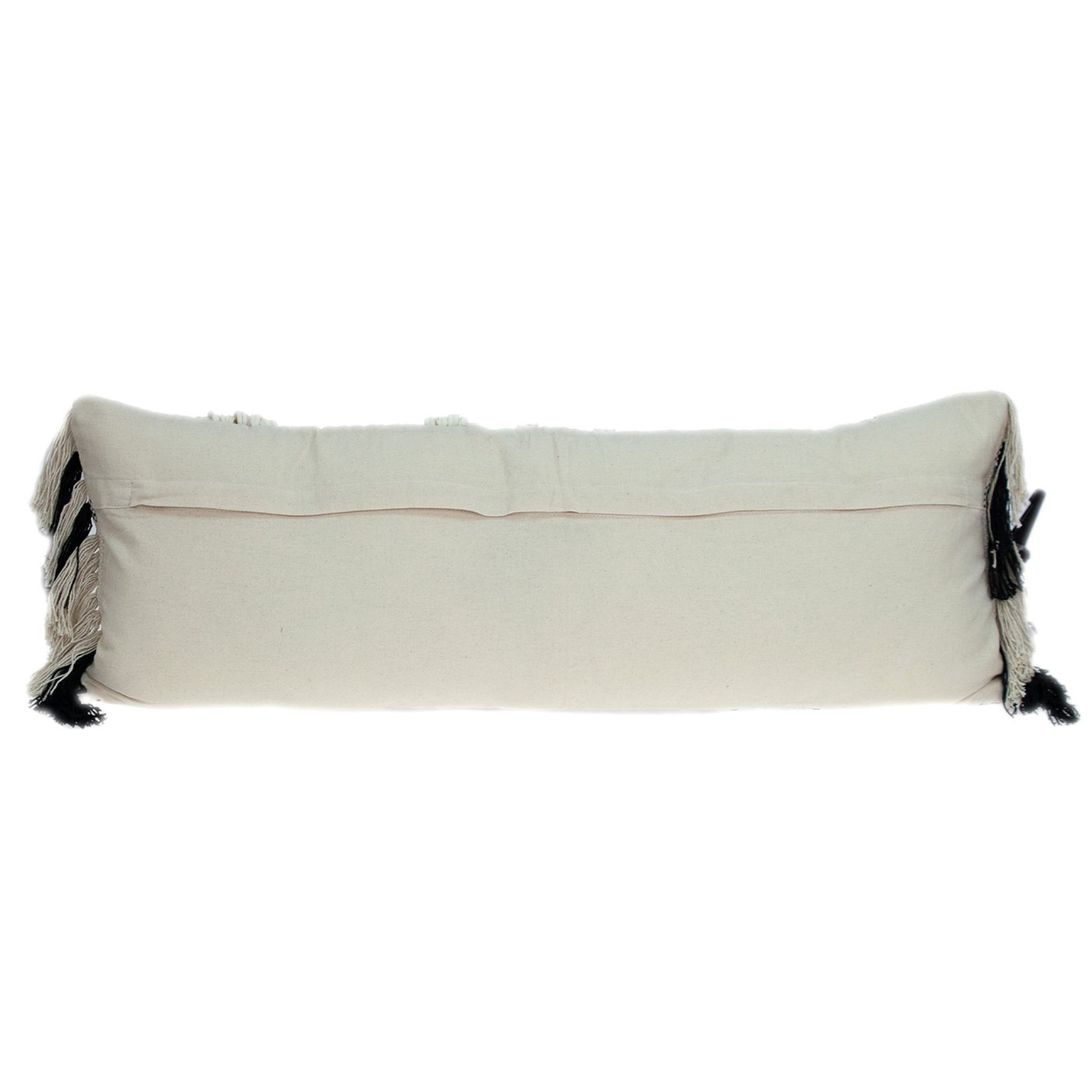 The geometric patterns and high-contrast black and white color scheme makes the Black and White Geo Long Lumbar Throw Pillow a focal point to your couch or bed. The whole color and design of the pillow emanates a sense of warmth. There are unique textures and different designs along with stylish fringe. The long length makes this especially comforting and great for a larger chair or space. Solid creamy beige back that includes zipper closure. 35” x 12” x 4”