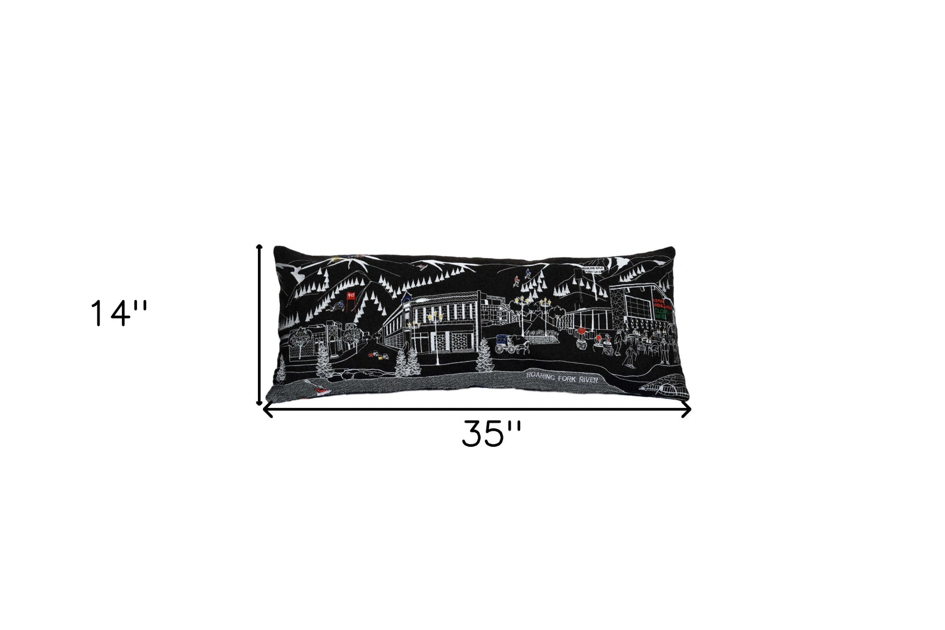 Showcase this famous city, with our Black Color Aspen Nighttime Skyline Queen Size Lumbar Decorative Pillow. The Nighttime view of Aspen from the Roaring Fork River is picture perfect. The gorgeous art features many famous landmarks and references for this destination city, rendering a modern whimsical way to bring this iconic cityscape to life. Made of a wool/nylon blend, this high quality stitched decorative pillow features white on black embroidered artwork mixed with pops of color that highlight important and recognizable icons from this popular Colorado city known for its snow sports, fine dining, and resorts. This pillow makes a great gift, decorative accent and conversation piece. 4" x 35" x 14"