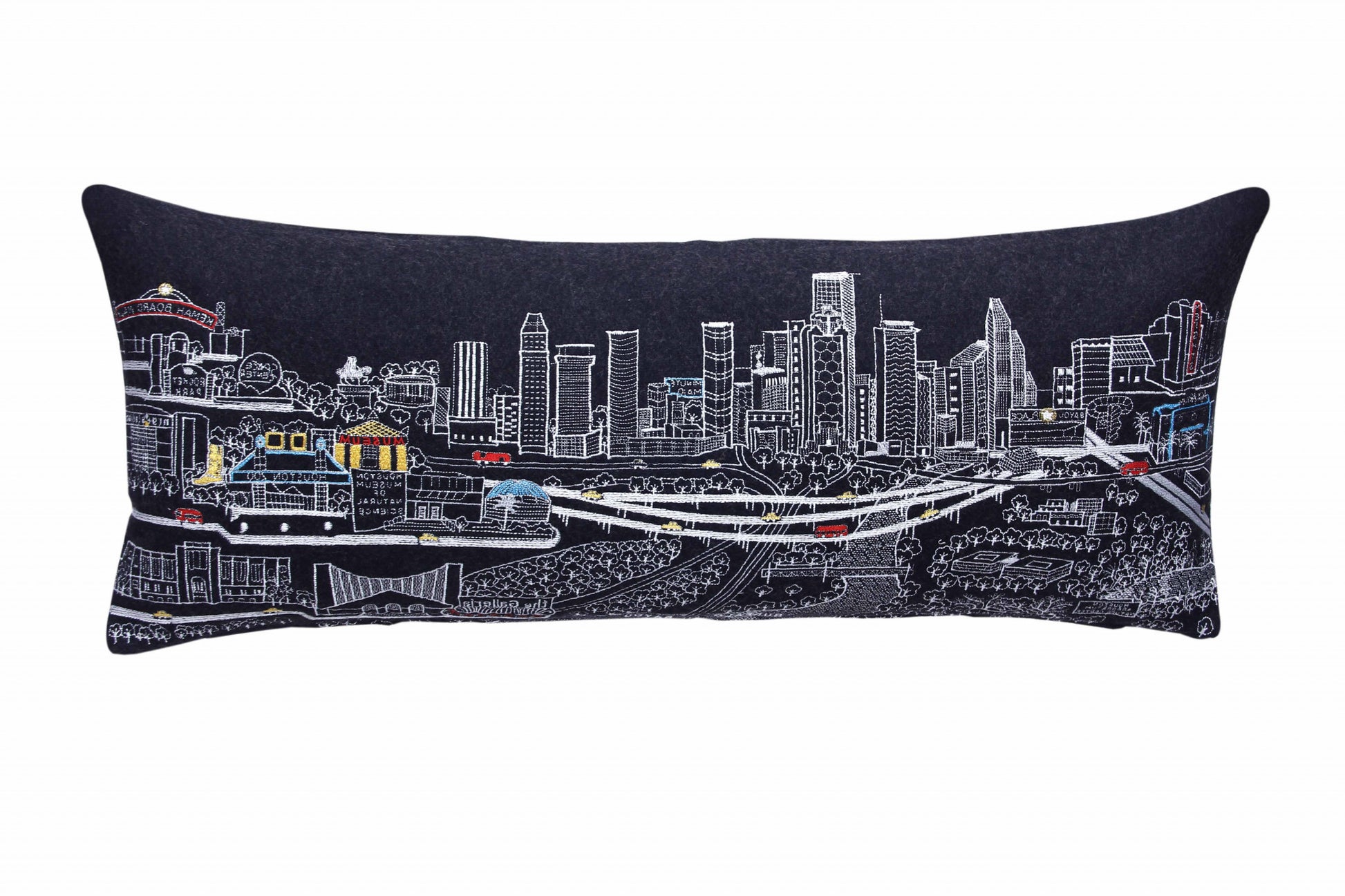 Showcase this famous city, with our Black Color Houston Nighttime Skyline Queen Size Lumbar Decorative Pillow. The Nighttime view of Houston, is picture perfect. The gorgeous art features many famous landmarks and references for this destination city, rendering a modern whimsical way to bring this iconic cityscape to life. Made of a wool/nylon blend, this high quality stitched decorative pillow features white on black embroidered artwork mixed with pops of color that highlight important and recognizable icons from this popular Texas city. This pillow makes a great gift, decorative accent and conversation piece. 4" x 35" x 14"