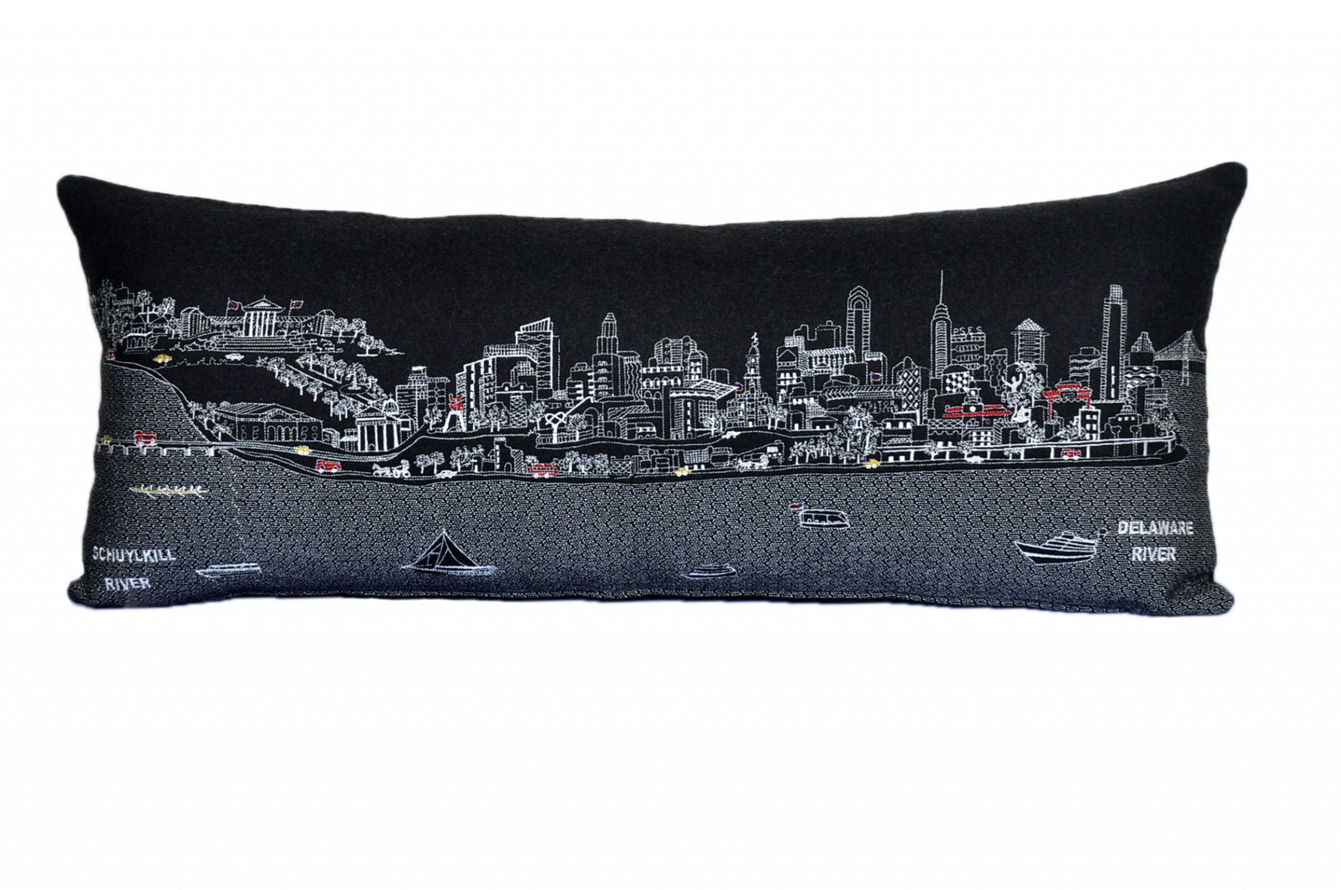 Showcase this famous city, with our Black Color Philadelphia Nighttime Skyline Queen Size Lumbar Decorative Pillow. The Nighttime view of the Philly shore line from the Schuylkill and Delaware Rivers is picturesque. The gorgeous art features many famous landmarksand references, rendering a modern whimsical way to bring this iconic cityscape to life. Made of a wool/nylon blend, this high quality stitched decorative pillow features white on black embroidered artwork mixed with pops of color that highlight important and recognizable icons from this fabulous city. This pillow makes a great gift, decorative accent and conversation piece. 4" x 35" x 14"