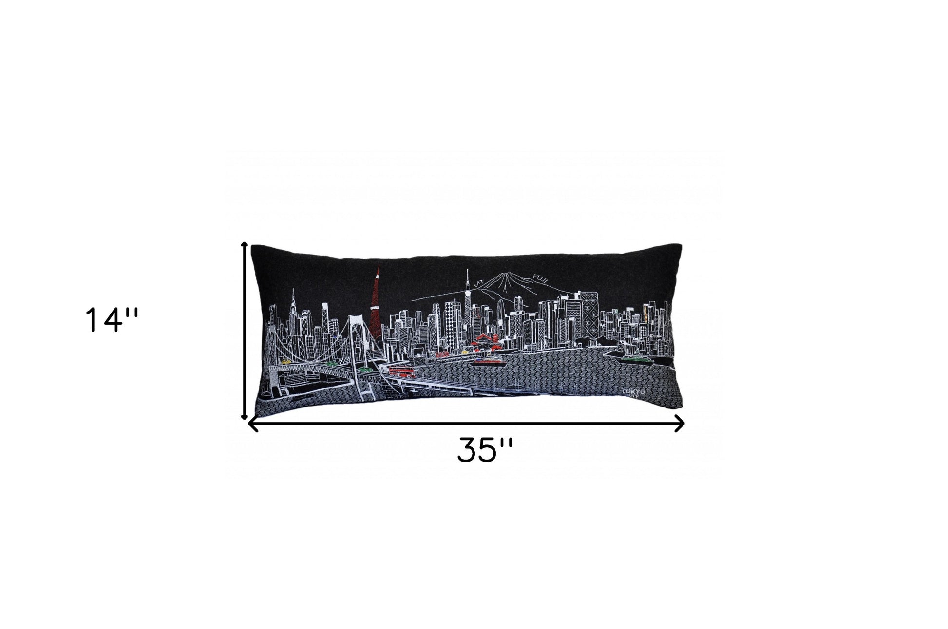 Showcase one of the most famous cities in the world with our Black Color Tokyo Nighttime Skyline Queen Size Lumbar Decorative Pillow. This Nighttime view from Tokyo Bay, is a stunning way to represent one of the most important and visited cities in the world. The gorgeous art features famous architecture and landmarks including Mt. Fuji in the background, rendering a modern whimsical way to bring this iconic cityscape to life. Made of a wool/nylon blend, this high quality stitched decorative pillow features white on black embroidered artwork mixed with pops of color that highlight important and recognizable icons from this fabulous city. This pillow makes a great gift, decorative accent and conversation piece. 4" x 35" x 14"