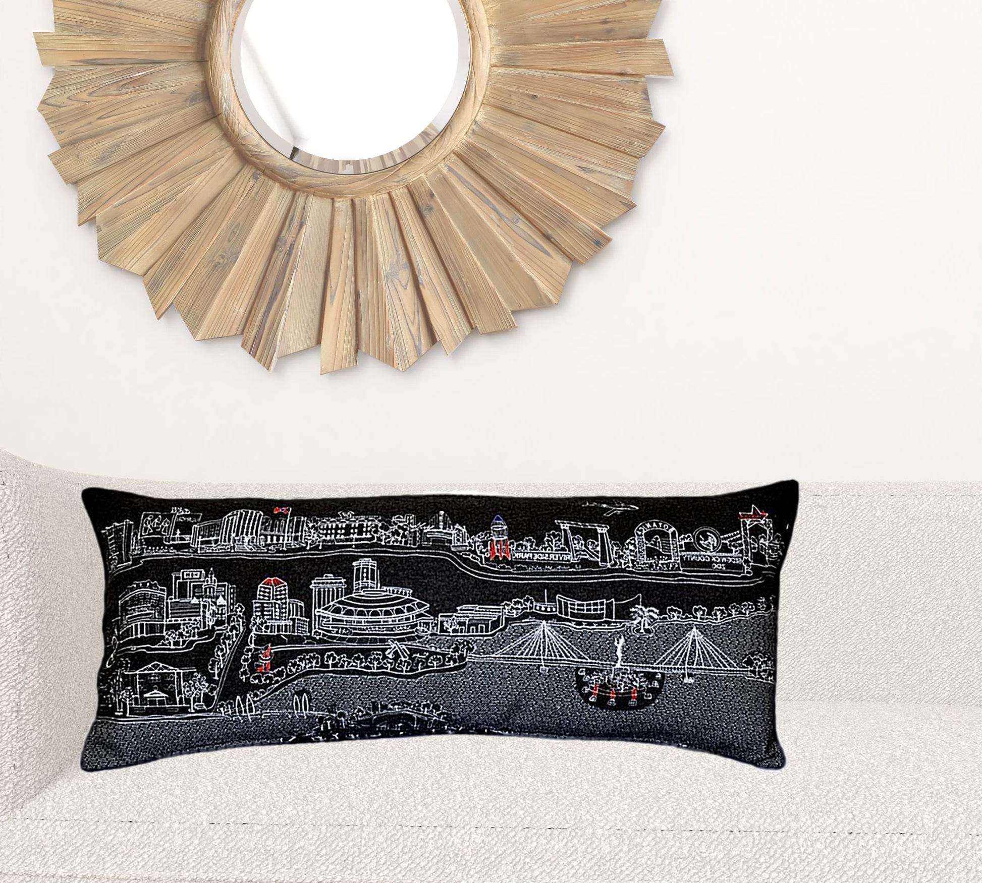 Showcase this famous city, with our Black Color Wichita Nighttime Skyline Queen Size Lumbar Decorative Pillow. The Nighttime view of Wichita, is picture perfect. The gorgeous art features many famous landmarks and references for this destination city, rendering a modern whimsical way to bring this iconic city to life. Made of a wool/nylon blend, this high quality stitched decorative pillow features white on black embroidered artwork mixed with pops of color that highlight important and recognizable icons from this popular and bustling city. This pillow makes a great gift, decorative accent and conversation piece. 4" x 35" x 14"