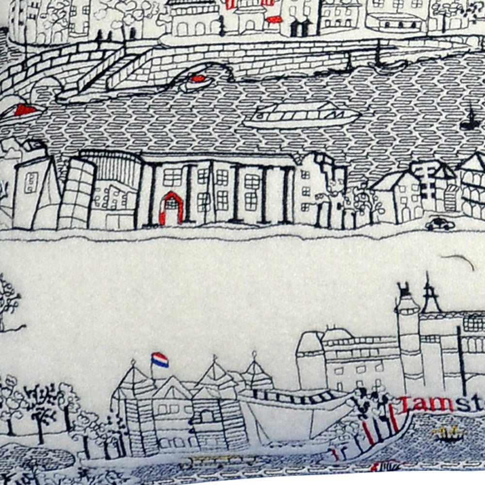 Showcase this world famous city, with our Cream Color Amsterdam Daylight Skyline Queen Size Lumbar Decorative Pillow. The daylight view of Amsterdam with the beautiful River Amstel running through it, is picture perfect. The gorgeous art features many famous landmarks and references for this destination city, rendering a modern whimsical way to bring this iconic citys to life. Made of a wool/nylon blend, this high quality stitched decorative pillow features black on white embroidered artwork mixed with pops of color that highlight important and recognizable icons from this internationally popular city. This pillow makes a great gift, decorative accent and conversation piece. 4" x 35" x 14"