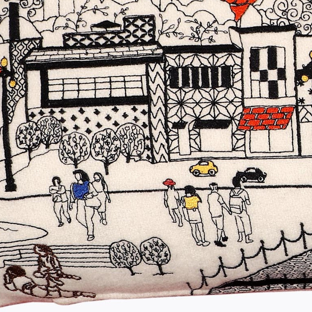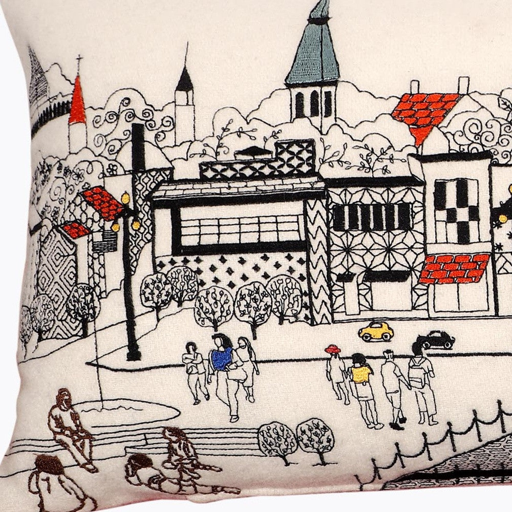 Showcase this famous city, with our Cream Color Annapolis Daylight Skyline Queen Size Lumbar Decorative Pillow. The daylight view of Annapolis from the Chesapeake Bay is picture perfect. The gorgeous art features many famous landmarks and references for this destination city, rendering a modern whimsical way to bring this iconic cityscape to life. Made of a wool/nylon blend, this high quality stitched decorative pillow features black on white embroidered artwork mixed with pops of color that highlight important and recognizable icons from this popular Maryland city known for it's Naval presence and gorgeous waterfront. This pillow makes a great gift, decorative accent and conversation piece. 4" x 35" x 14"