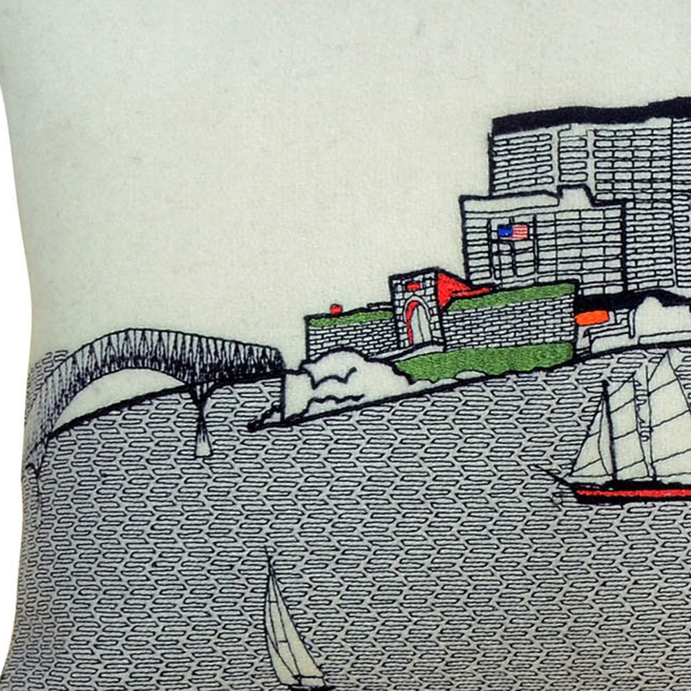 Showcase this famous city, with our Cream Color Baltimore Daylight Skyline Queen Size Lumbar Decorative Pillow. The daylight view of Baltimore Inner Harbor from the Chesapeake Bay, is picture perfect. The gorgeous art features many famous landmarks and references for this destination city, rendering a modern whimsical way to bring this iconic cityscape to life. Made of a wool/nylon blend, this high quality stitched decorative pillow features black on white embroidered artwork mixed with pops of color that highlight important and recognizable icons from this popular Maryland city. This pillow makes a great gift, decorative accent and conversation piece. 4" x 35" x 14"
