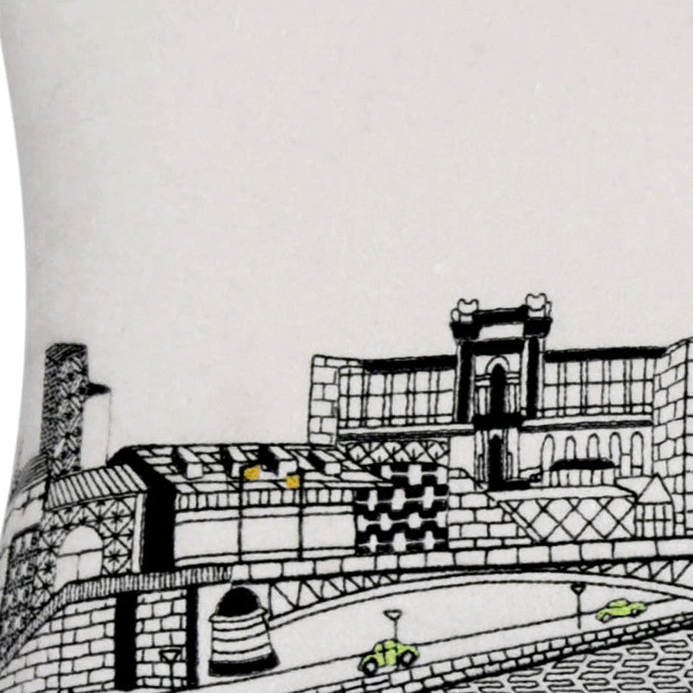 Showcase this world famous city, with our Cream Color Frankfurt Daylight Skyline Queen Size Lumbar Decorative Pillow. The daylight view of Frankfurt, is picture perfect. The gorgeous art features many famous landmarks and references for this destination city, rendering a modern whimsical way to bring this iconic citys to life. Made of a wool/nylon blend, this high quality stitched decorative pillow features black on white embroidered artwork mixed with pops of color that highlight important and recognizable icons from this internationally important and popular German city. This pillow makes a great gift, decorative accent and conversation piece. 4" x 35" x 14"