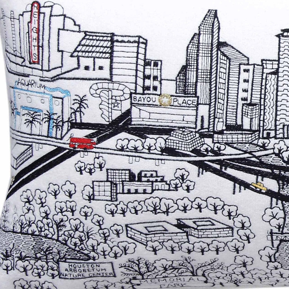 Showcase this famous city, with our Cream Color Houston Daylight Skyline Queen Size Lumbar Decorative Pillow. The daylight view of Houston, is picture perfect. The gorgeous art features many famous landmarks and references for this destination city, rendering a modern whimsical way to bring this iconic cityscape to life. Made of a wool/nylon blend, this high quality stitched decorative pillow features black on white embroidered artwork mixed with pops of color that highlight important and recognizable icons from this popular Texas city. This pillow makes a great gift, decorative accent and conversation piece. 4" x 35" x 14"