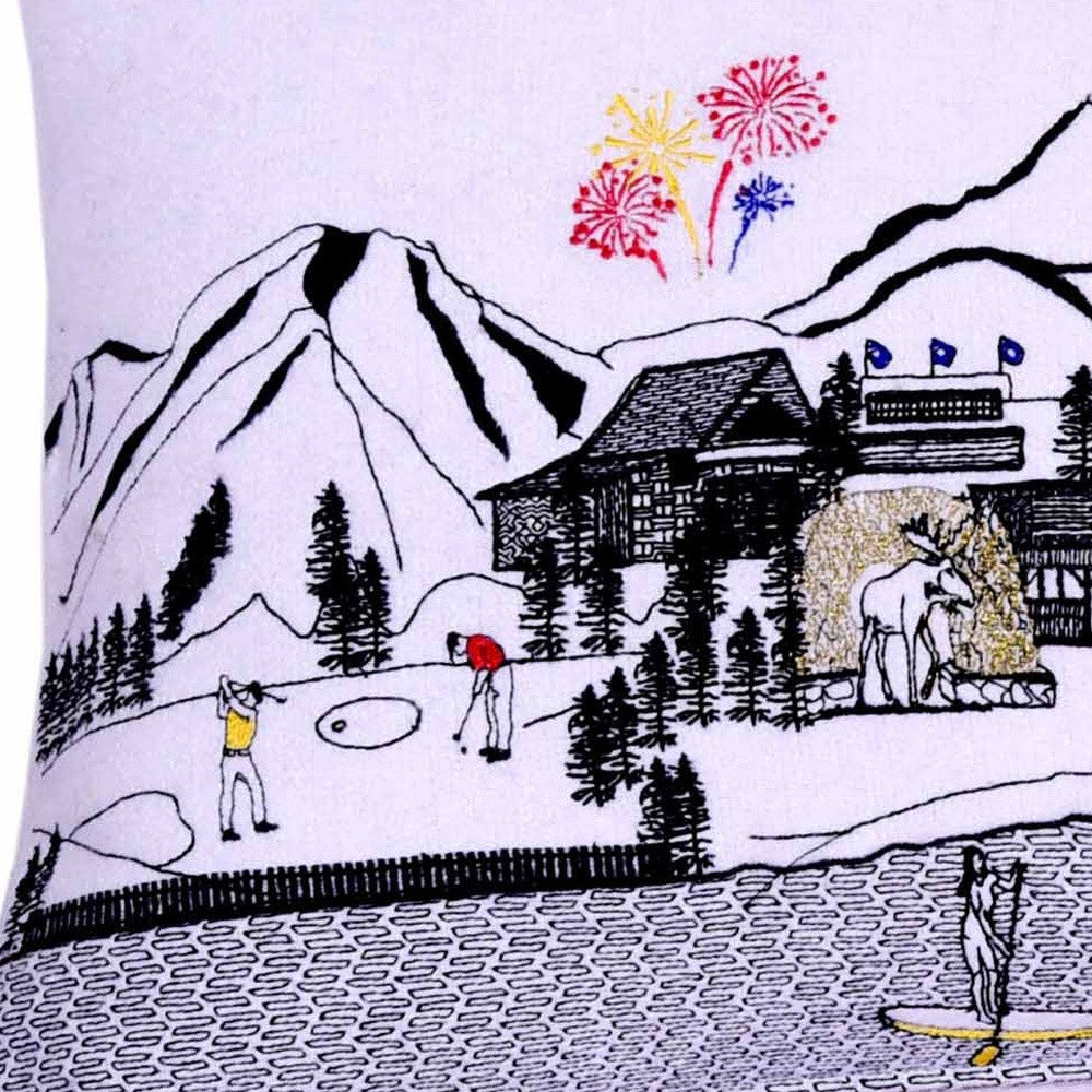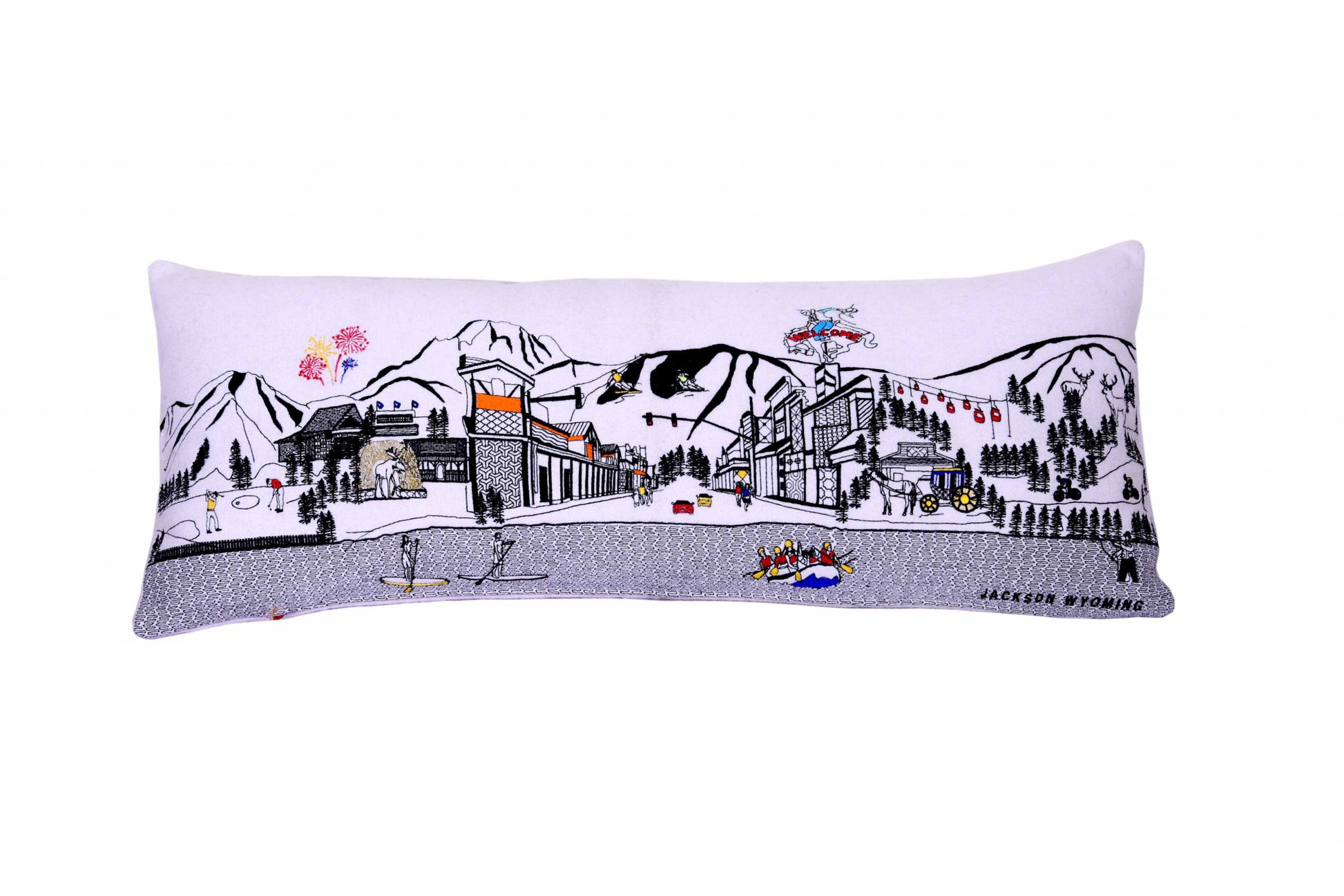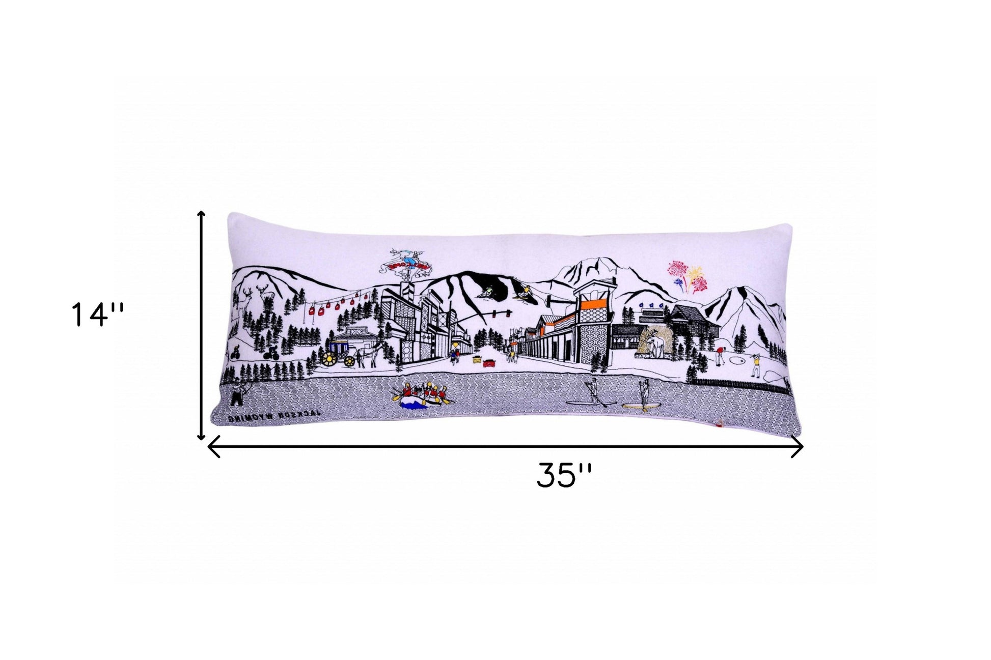 Showcase this famous city, with our Cream Color Jackson Daylight Skyline Queen Size Lumbar Decorative Pillow. The daylight view of Jackson, is picture perfect. The gorgeous art features many famous landmarks and references for this destination city, rendering a modern whimsical way to bring this iconic cityscape to life. Made of a wool/nylon blend, this high quality stitched decorative pillow features black on white embroidered artwork mixed with pops of color that highlight important and recognizable icons from this popular Wyoming city known for its outdoor sports. This pillow makes a great gift, decorative accent and conversation piece. 4" x 35" x 14"