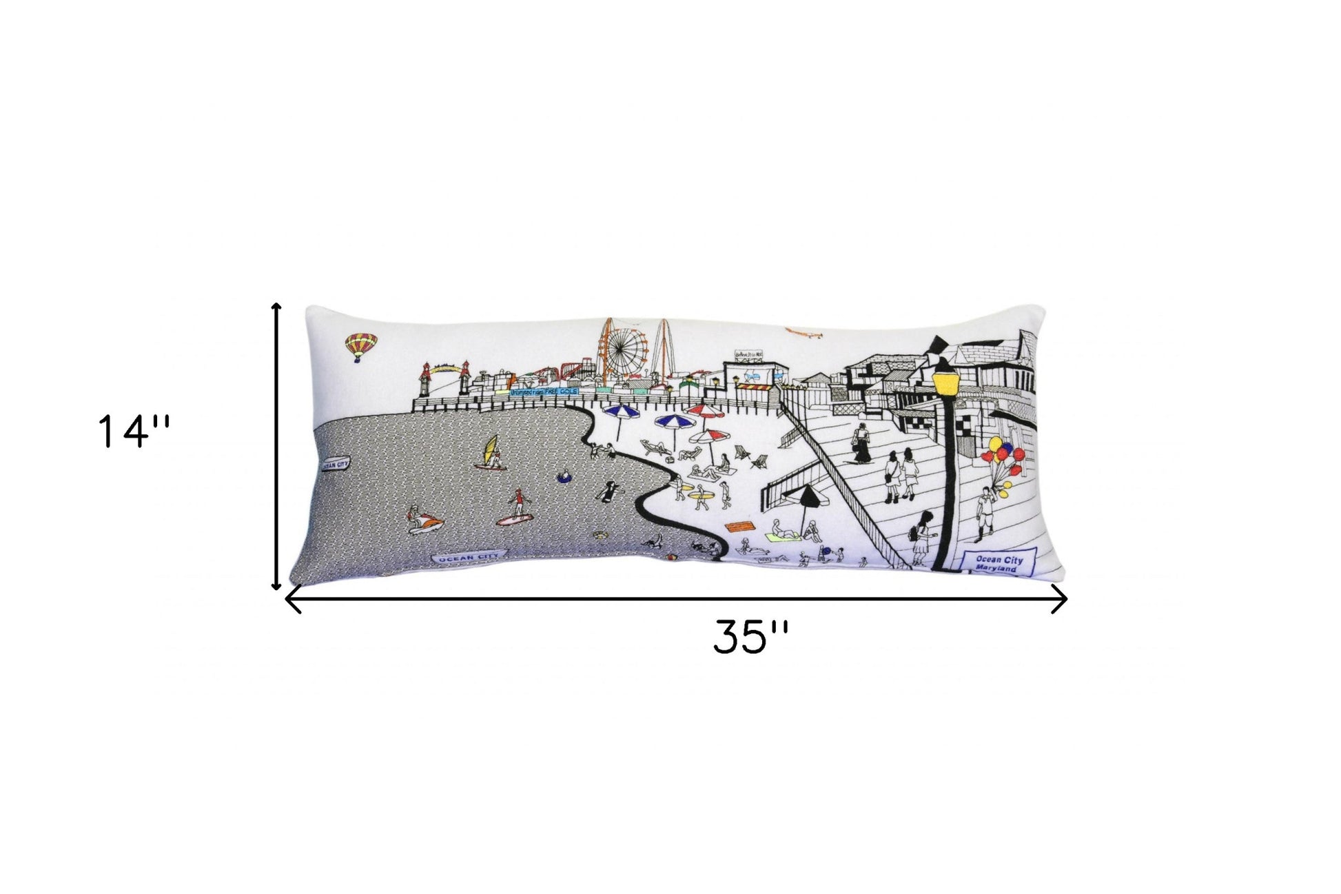 Showcase this famous city, with our Cream Color Ocean City Maryland Daylight Skyline Queen Size Lumbar Decorative Pillow. The daylight view of Ocean City Maryland beach town, is picture perfect. The gorgeous art features many famous landmarks and references for this destination city, rendering a modern whimsical way to bring this iconic beach vacation destination to life. Made of a wool/nylon blend, this high quality stitched decorative pillow features black on white embroidered artwork mixed with pops of color that highlight important and recognizable icons from this popular city. This pillow makes a great gift, decorative accent and conversation piece. 4" x 35" x 14"