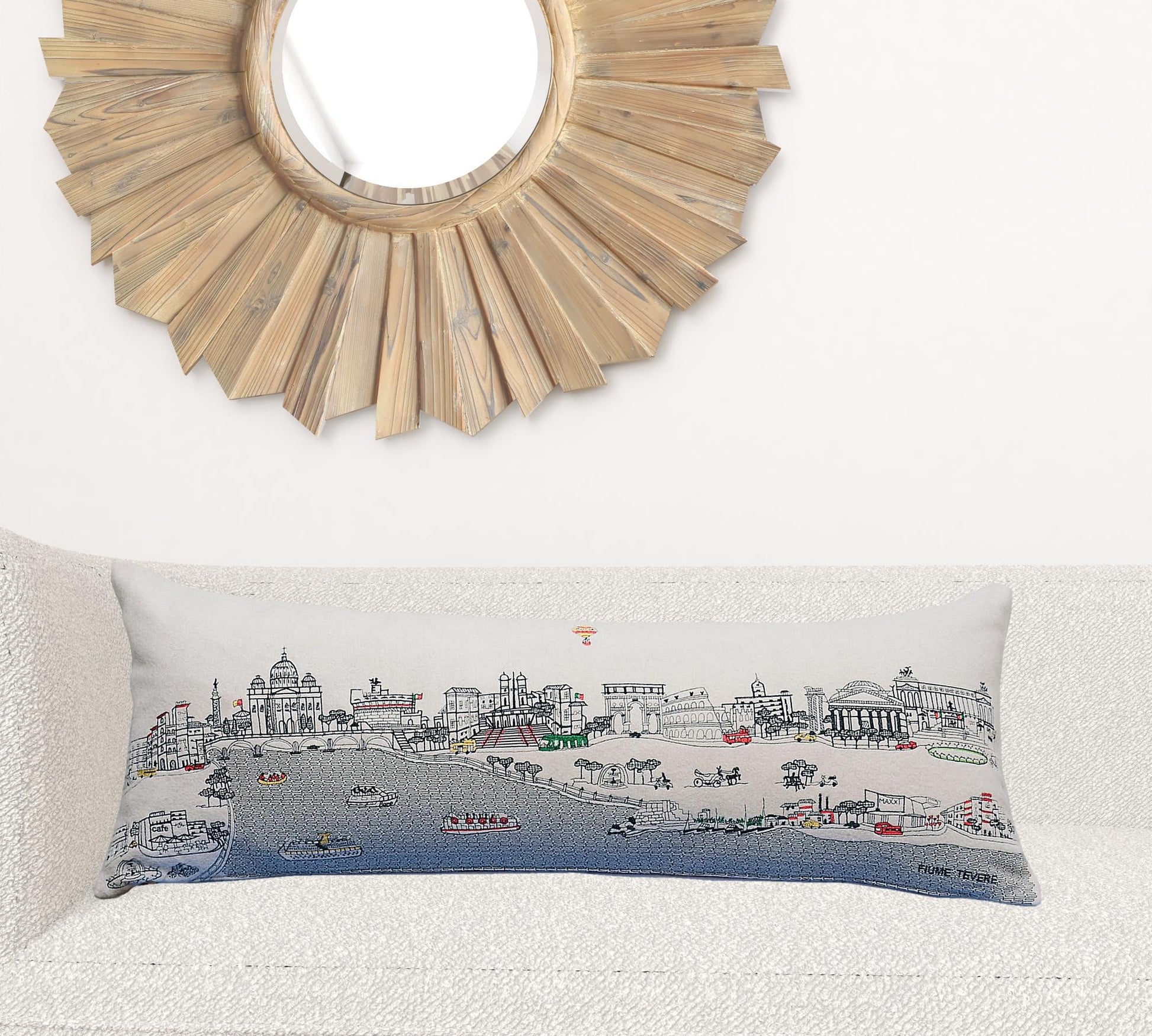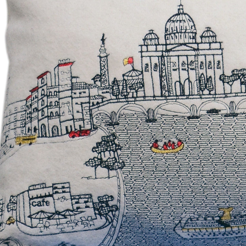 Showcase one of the most famous cities in the world with our Cream Color Rome Daylight Skyline Queen Size Lumbar Decorative Pillow. This daylight view of Rome is one of the most famous landscapes in the world. The gorgeous art features famous architecture, references, and landmarks including the Vatican and Colosseum, rendering a modern whimsical way to bring this iconic cityscape to life. Made of a wool/nylon blend, this high quality stitched decorative pillow features black on white embroidered artwork mixed with pops of color that highlight important and recognizable icons from this fabulous city. This pillow makes a great gift, decorative accent and conversation piece. 4" x 35" x 14"