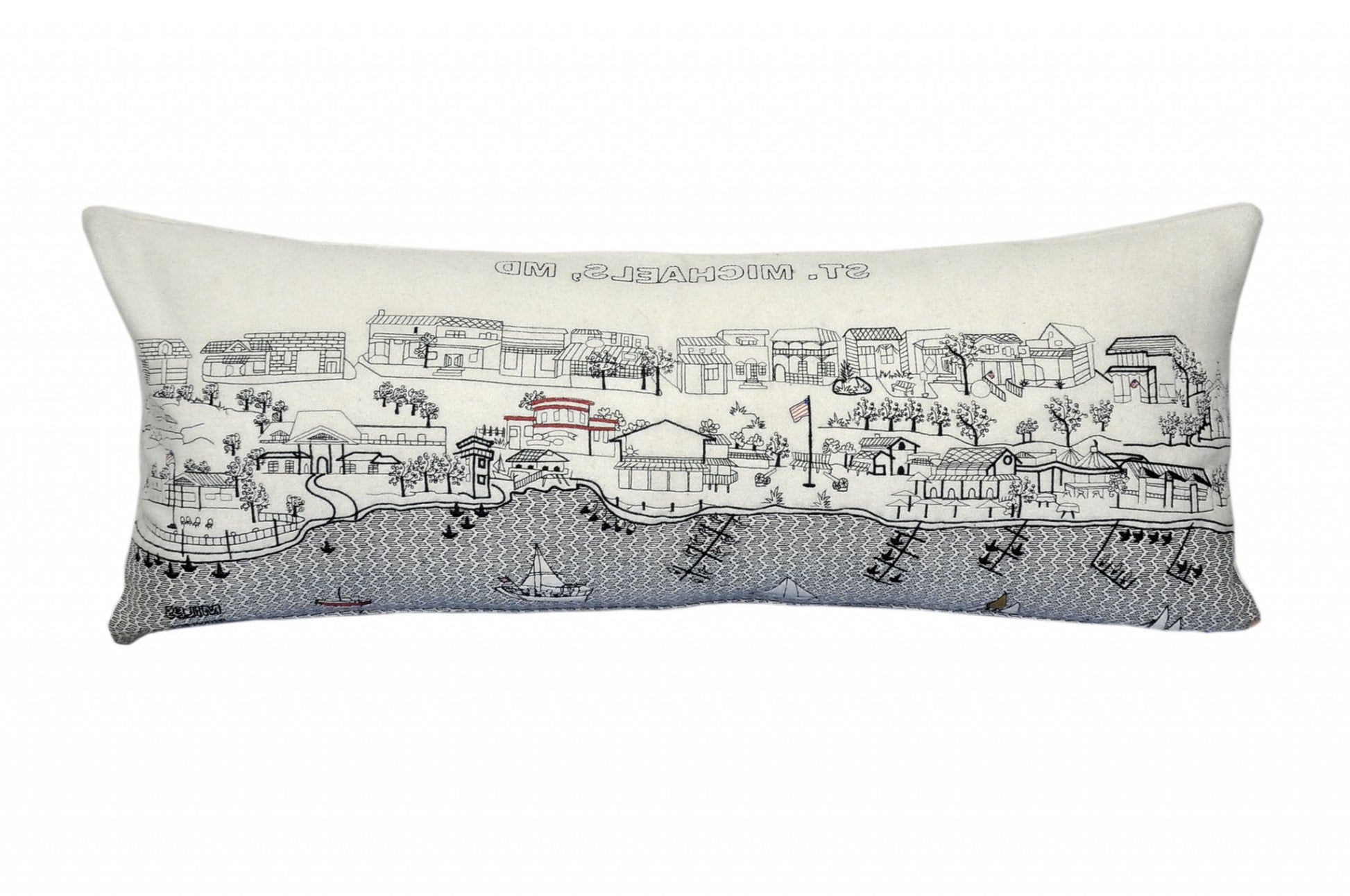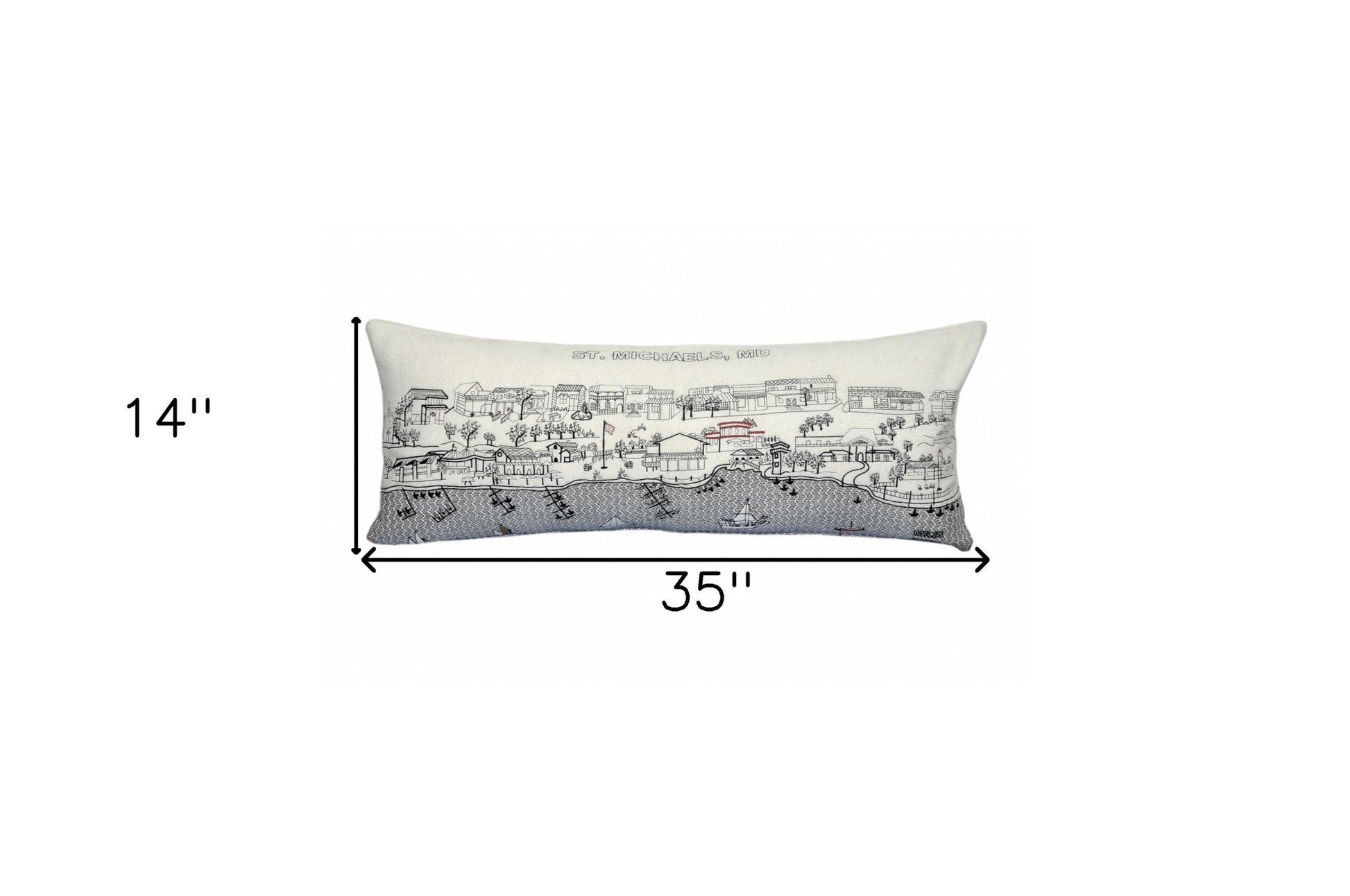 Showcase this famous city, with our Cream Color St Michael's Harbour Daylight Skyline Queen Size Lumbar Decorative Pillow. The daylight view of the St Michael's is picture perfect. The gorgeous art features many famous landmarks and references for this destination city, rendering a modern whimsical way to bring this beautiful coastal vacation spot to life. Made of a wool/nylon blend, this high quality stitched decorative pillow features black on white embroidered artwork mixed with pops of color that highlight important and recognizable icons from this popular Maryland city. This pillow makes a great gift, decorative accent and conversation piece. 4" x 35" x 14"