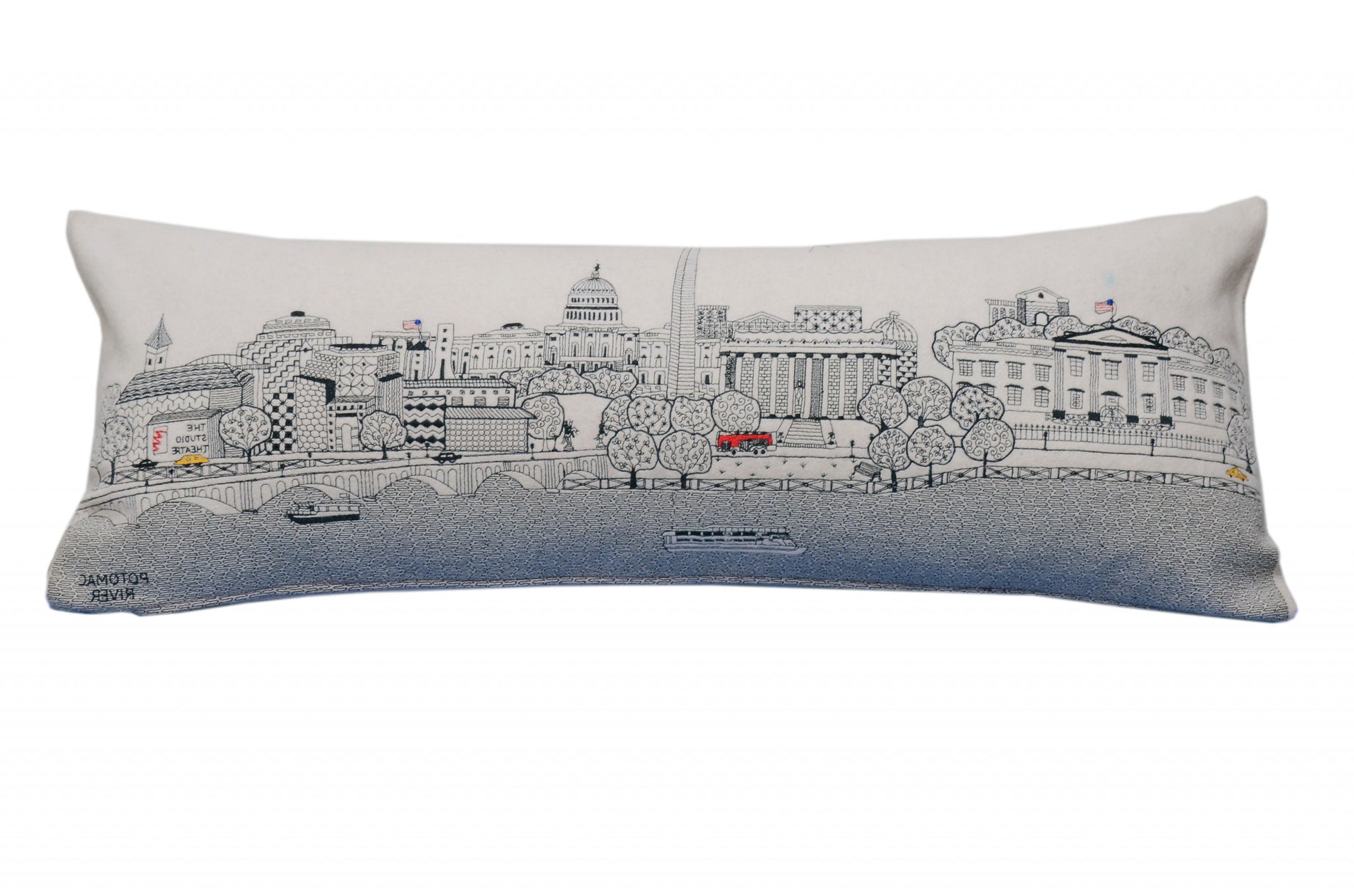 Showcase this famous city, with our Cream Color Washington DC Daylight Skyline Queen Size Lumbar Decorative Pillow. The daylight view of Washington DC from the Potomac River, is picture perfect. The gorgeous art features many famous landmarks and references for this destination city inclduing of course the White House and National Monument among others, rendering a modern whimsical way to bring this iconic cityscape to life. Made of a wool/nylon blend, this high quality stitched decorative pillow features black on white embroidered artwork mixed with pops of color that highlight important and recognizable icons from this popular and historic city. This pillow makes a great gift, decorative accent and conversation piece. 4" x 35" x 14"