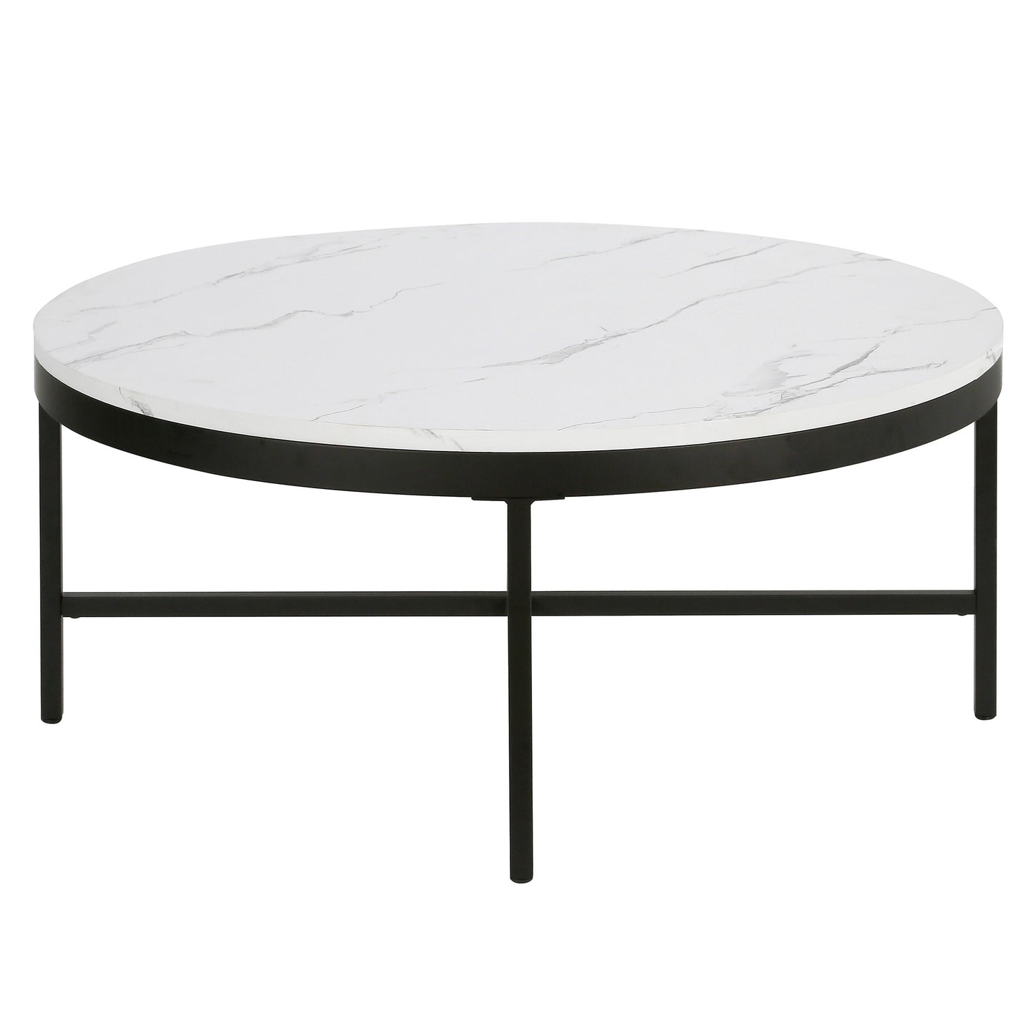 This good looking 36-inch white and black faux marble and steel round coffee table is not only practical, but good looking and built to last. Quality construction from the black steel base combines with white faux marble of the top to give this table a fresh and updated look. This round table features a fresh and stylish shape to give your room a visually pleasing accent. If you're looking for something that can fit into a living area, bedroom, or office, this coffee table is for you. This coffee table is the sturdy, reliable and stylish answer to your living room needs. 15-inch H x 36-inch W x 36-inch D