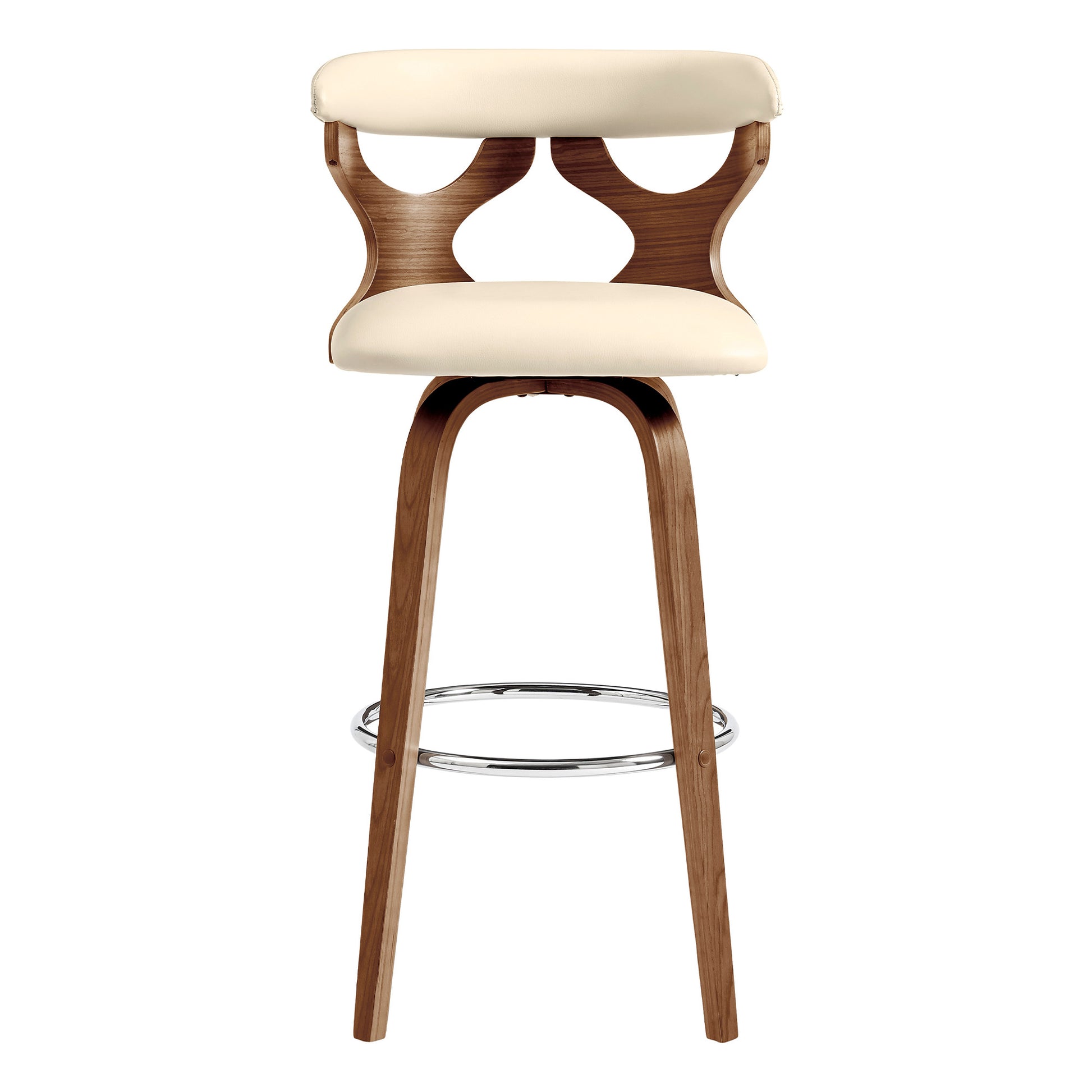 With this 36" cream faux leather and manufactured wood swivel counter height bar chair you can add design and extra seating to your space. Quality construction from walnut manufactured wood combines with cream faux leather to give this stool a fresh and updated look. The round shape of the seat combines with a full back to give this chair a comfortable and fashionable look. This stool will look great in your dining room, kitchen, bar, or recreation room. 36" H x 20" W x 19" D