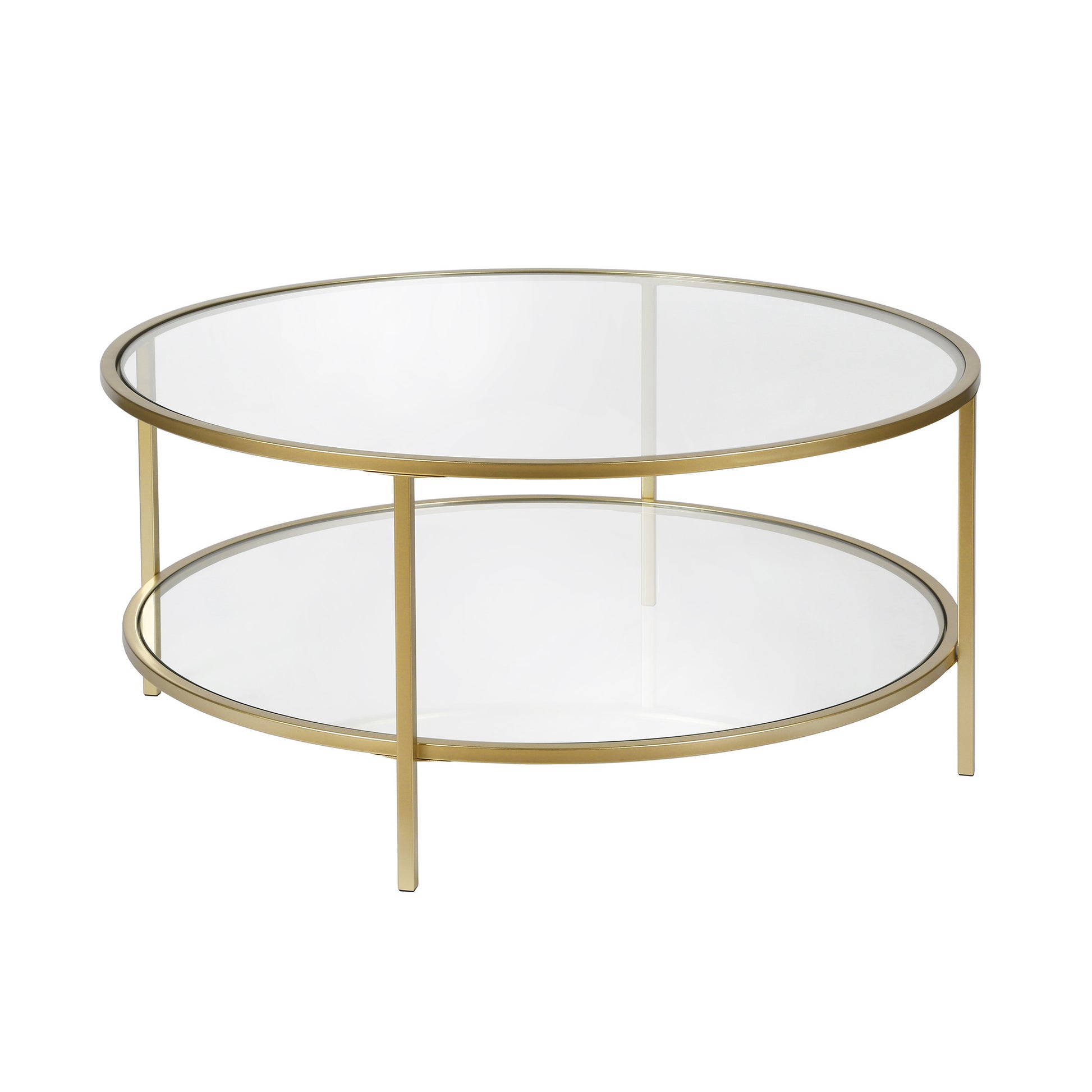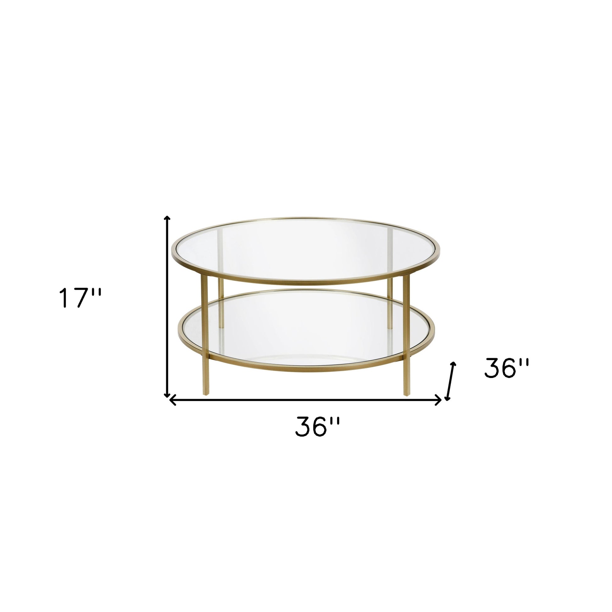 36" Gold Glass And Steel Round Coffee Table With Shelf