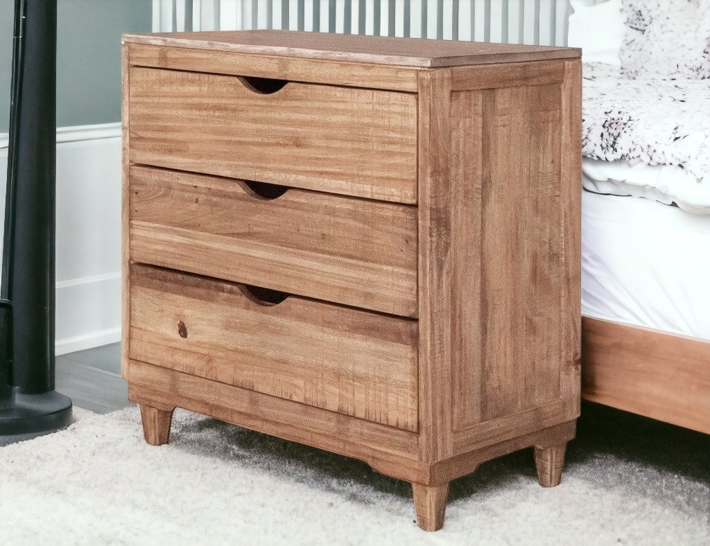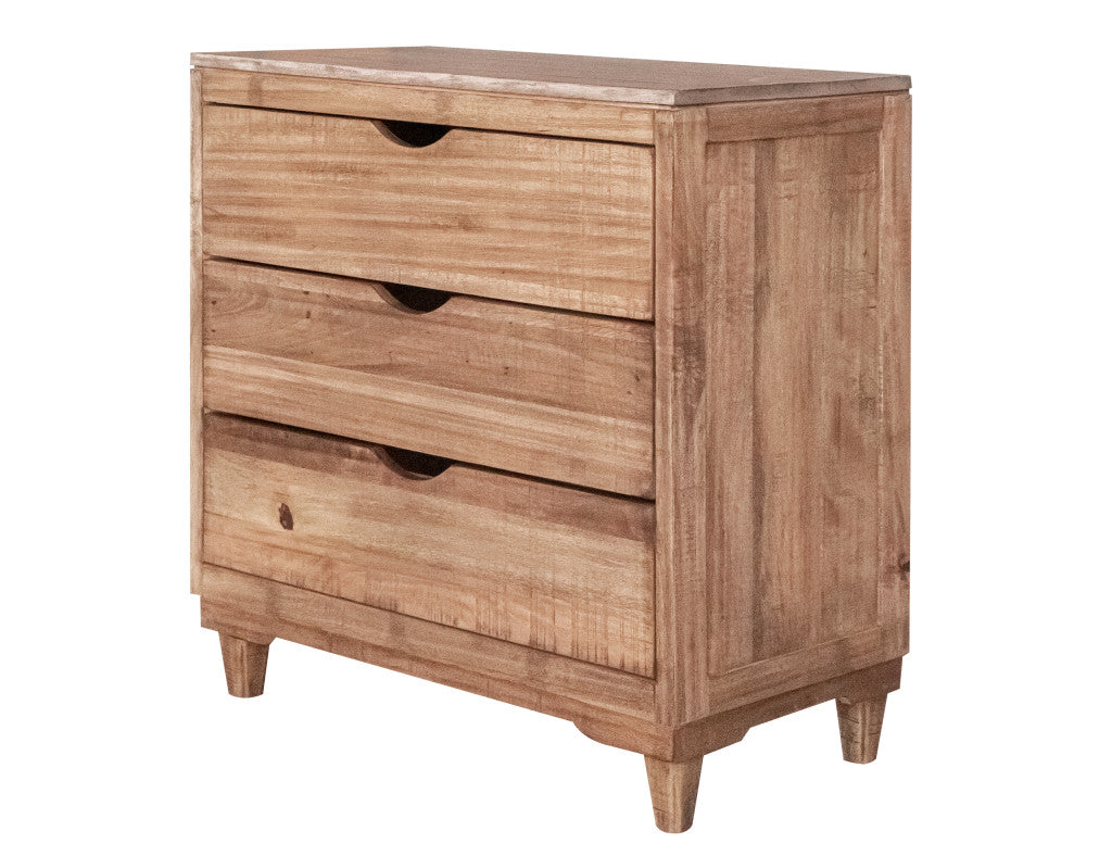 Add personality to your bedroom style and a feeling of coziness with this 36" natural solid wood three drawer standard chest. The space saving design of this standard chest makes it a great choice for space challenged spaces or small walls within your room. Equipped with three easy open drawers for practical and good looking clothing storage. This dresser is built to last from high quality solid wood, The natural coloration of this piece is neutral and will blend easily with most any decor. 37" H x 36" W x 17.75" D