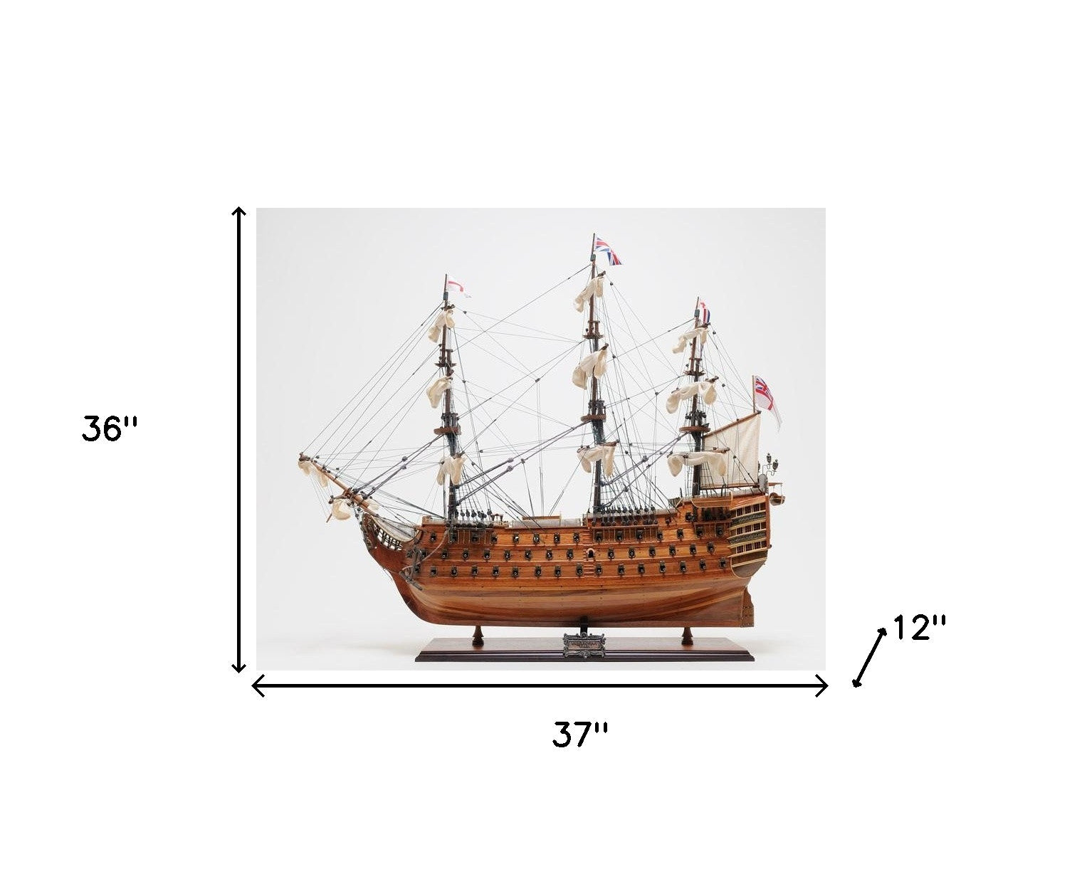 Magnificent and incredibly detailed replica, the HMS Victory Exclusive Edition Ship Model is a unique hand-built model of the legendary British Navy flagship commanded by Lord Nelson at the Battle of Trafalgar. Handmade by the most talented craftsman using high-quality western red cedar, rosewood, and mahogany. It features three large masts, and incredible details as captains sleeping and dining cabin, authentic handmade lifeboats and an exquisitely detailed admirals quarter. It comes with a solid wood base and a brass nameplate making it perfect for displaying. Being and Exclusive Edition, it features a unique serial number that allows you to see the production date, materials used and other interesting details. It is a sought-after piece for any history or maritime enthusiast. 36" H x 37" W x 12" D