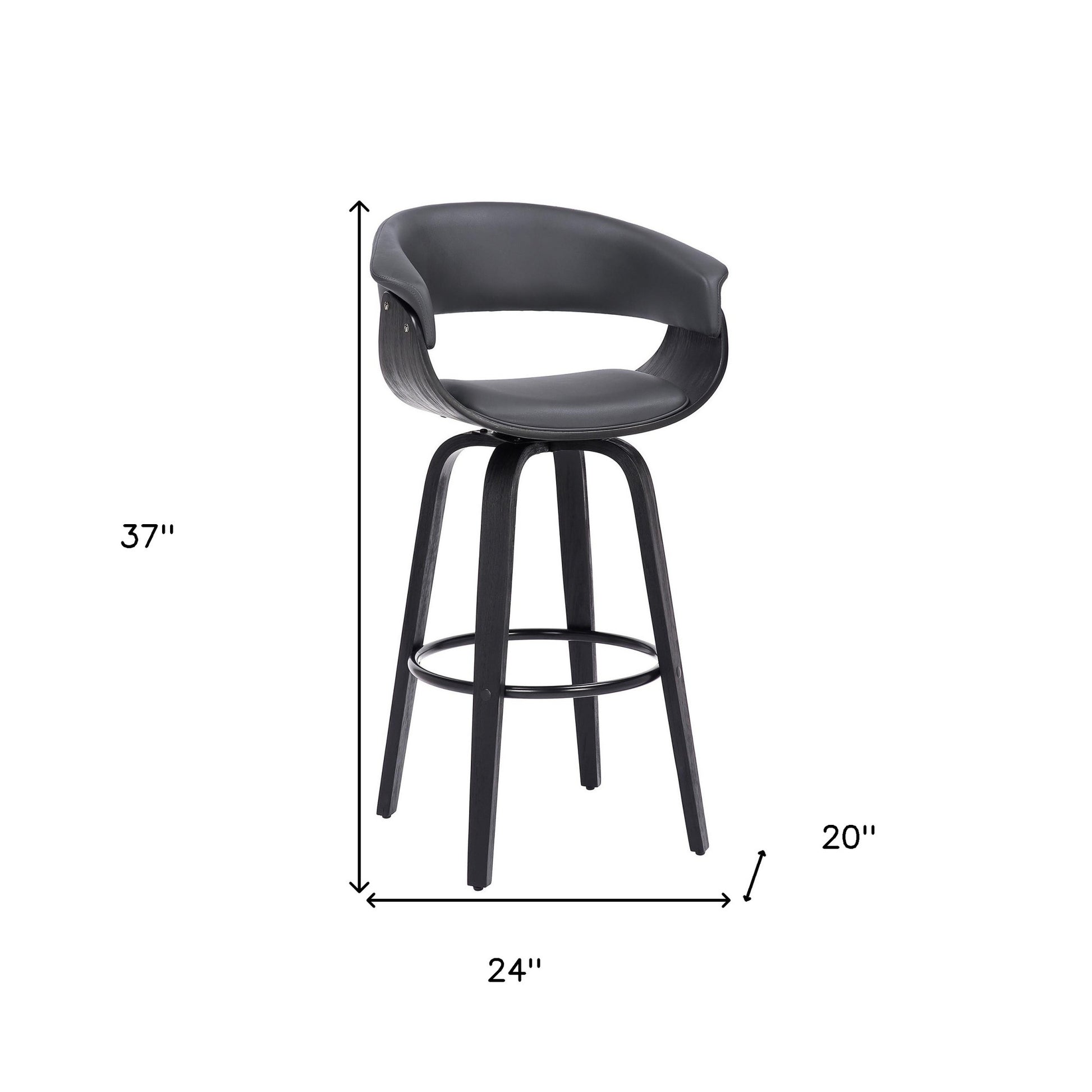 The perfect way to add some extra seating in your home, this 37" gray and black faux leather and solid wood swivel low back counter height bar chair with footrest will elevate the look and vibe of your room. Quality construction from black solid wood combines with gray faux leather to give this stool a fresh and updated look. The round shape of the seat combines with a low back to give this chair a comfortable and fashionable look. Designed with a footrest for comfort and convenience. 37" H x 24" W x 20" D