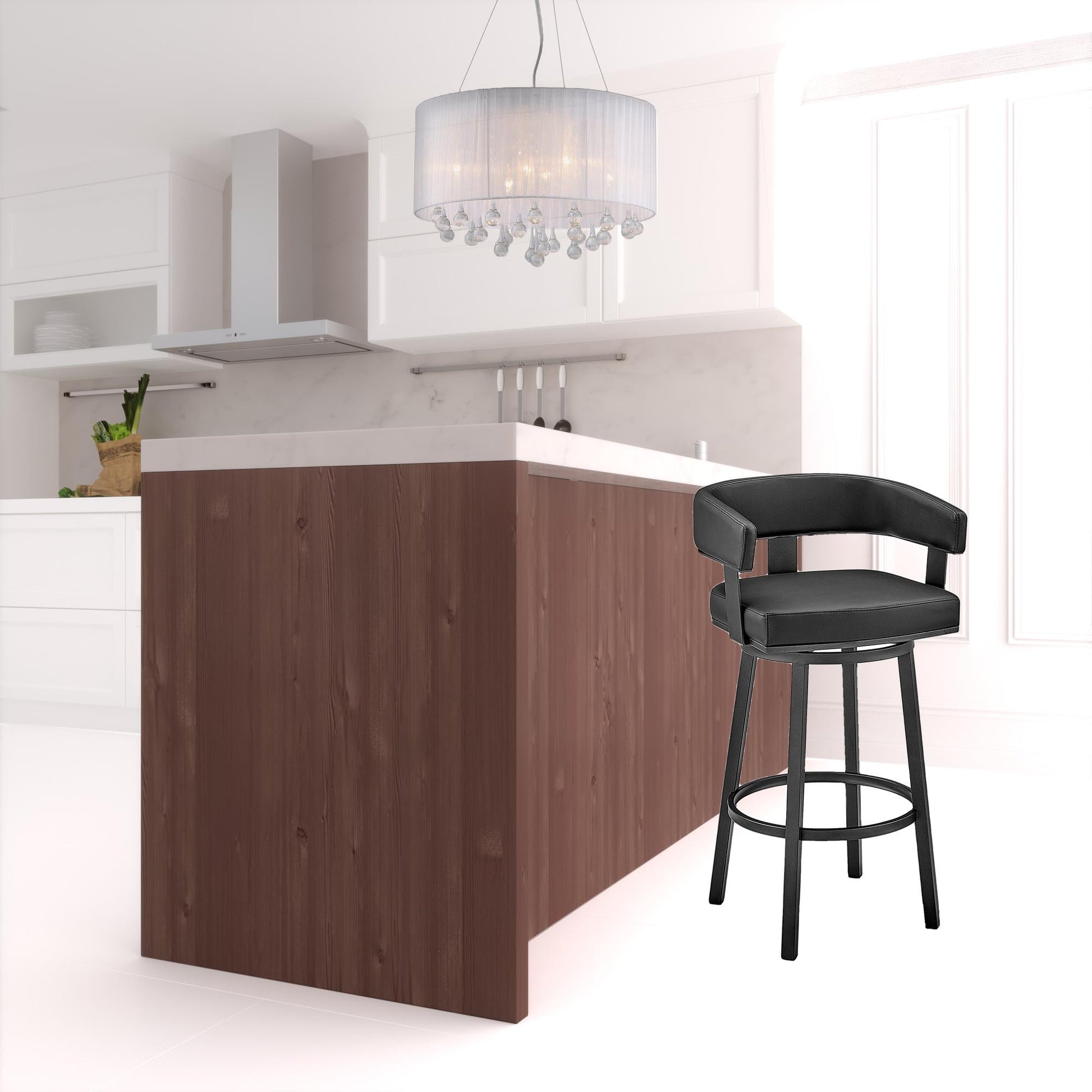 This 38" black faux leather and iron swivel low back bar height chair will be the perfect way to add some cool design and utility to your space similar to what you find in your favorite cafes or pubs. The base of this stool is made from iron in a black finish paint frame color that is a nice contrast to the black faux leather seat. Not only good looking and stylish, this chair features a round shaped seat and a low back for the ultimate in comfort and enjoyment. The armchair design gives you a great place to comfortably rest your arms. 38" H x 22" W x 20" D