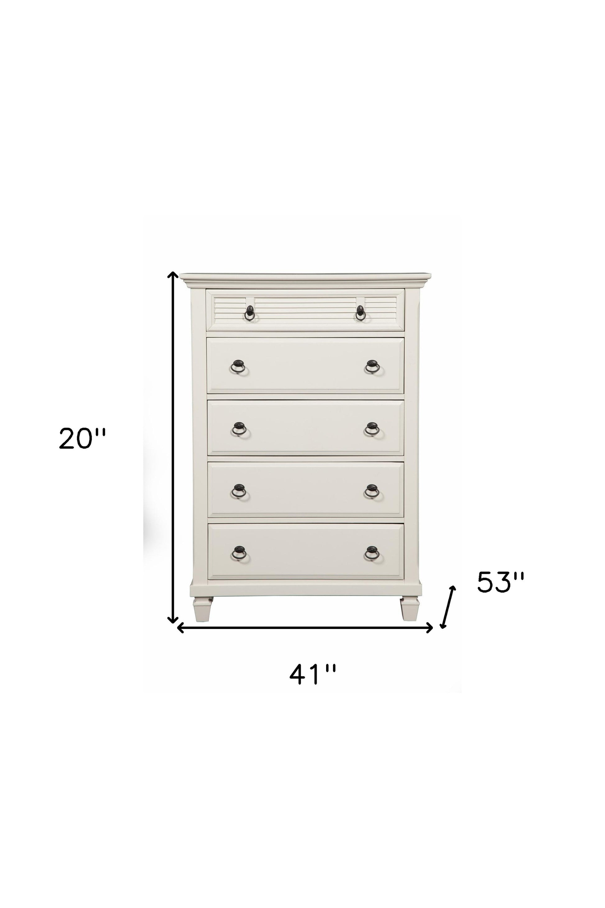Enhance your room into a visually delightful and highly functional space with this 38" white solid wood five drawer standard chest. The space saving design of this standard chest makes it a great choice for space challenged spaces or small walls within your room. Equipped with five easy open drawers for practical and good looking clothing storage. This dresser is built to last from high quality solid wood, The white coloration of this piece is neutral and will blend easily with most any decor. 50" H x 38" W x 18" D
