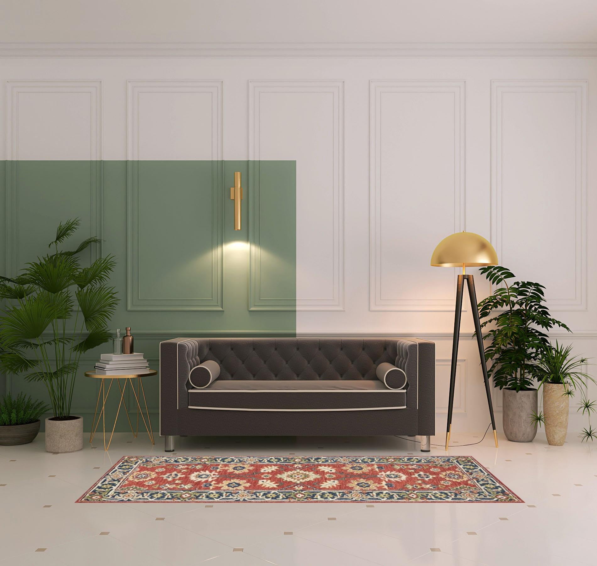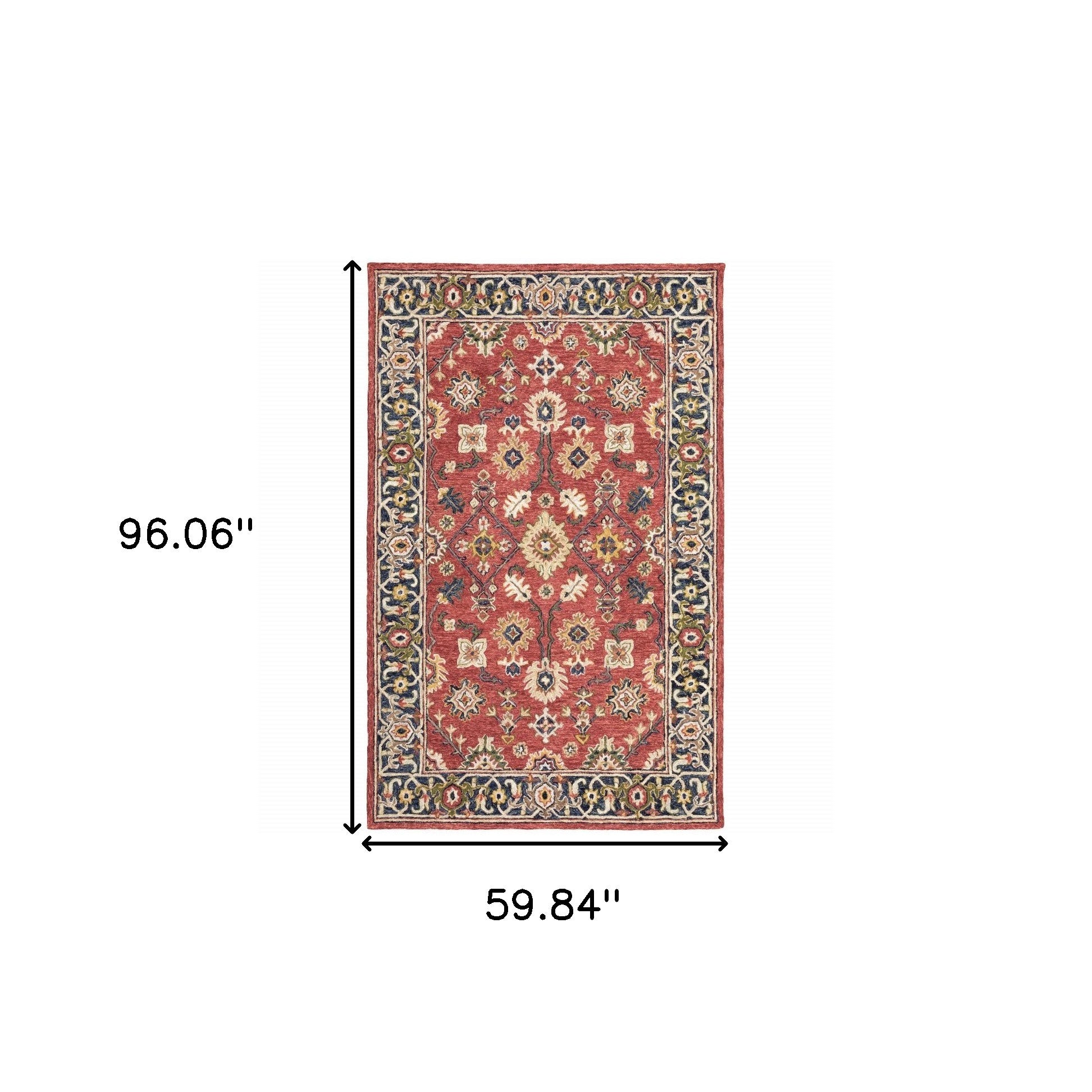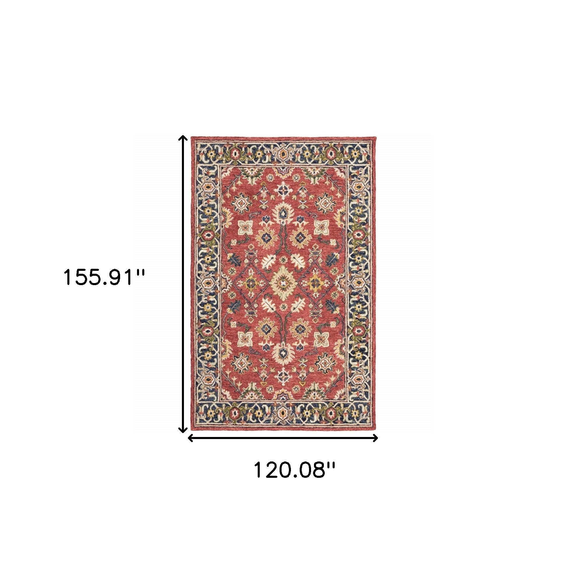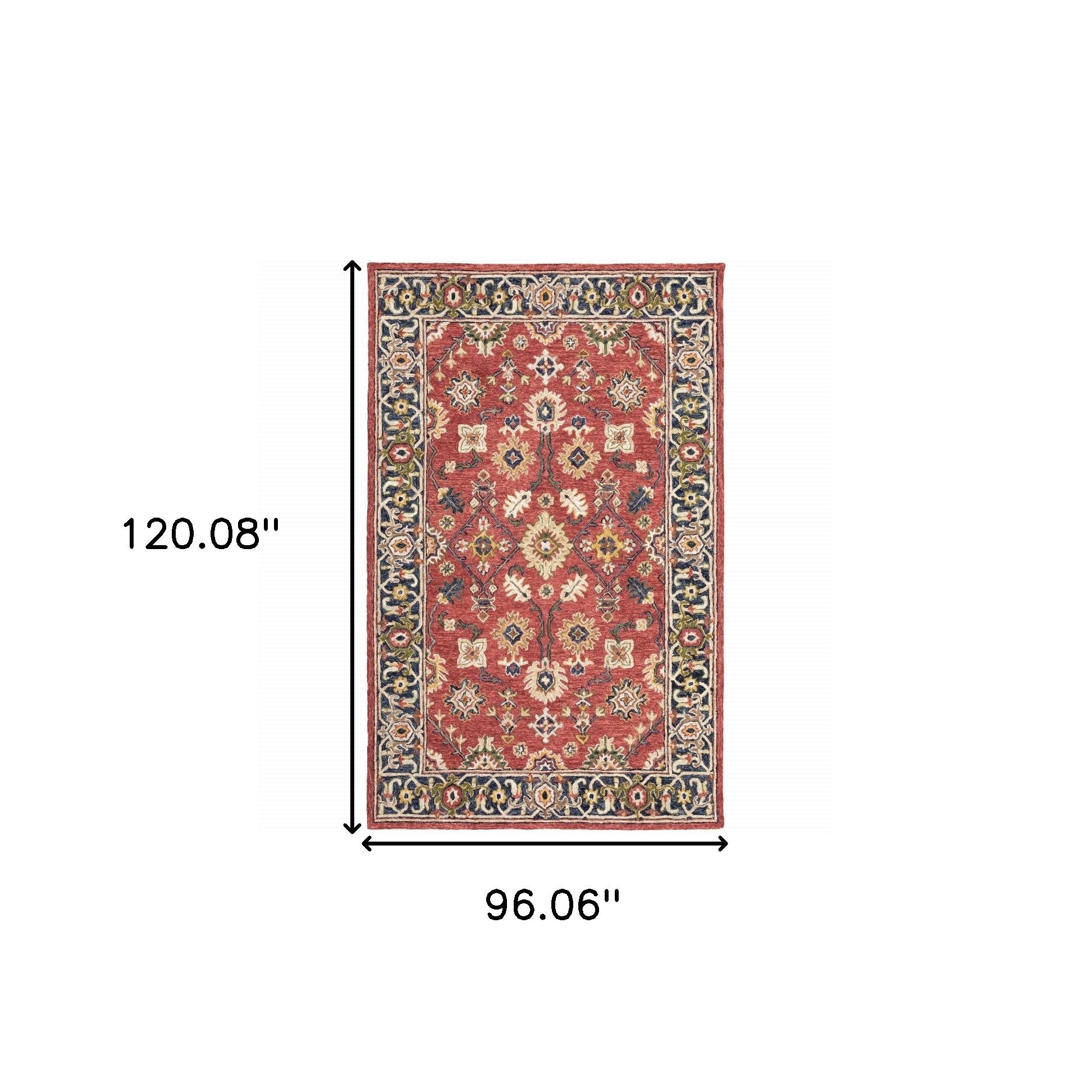 Offering the charm of traditional styling, this Red and Blue Bohemian Area Rug is an ideal accent to add a dramatic touch to your living space. The rug features a bold border with intricate patterns in spruce blue and ivory combined with a series of ikat-styled floral motifs in the center on a soft red base. Made with space-dyed wool for durability and the handcrafted loop-pile construction adds to its rich surface texture. The blend of bold and neutrals make this area rug a compelling piece to add an antique flair to your space. 1” x 96.06” x 120.08”