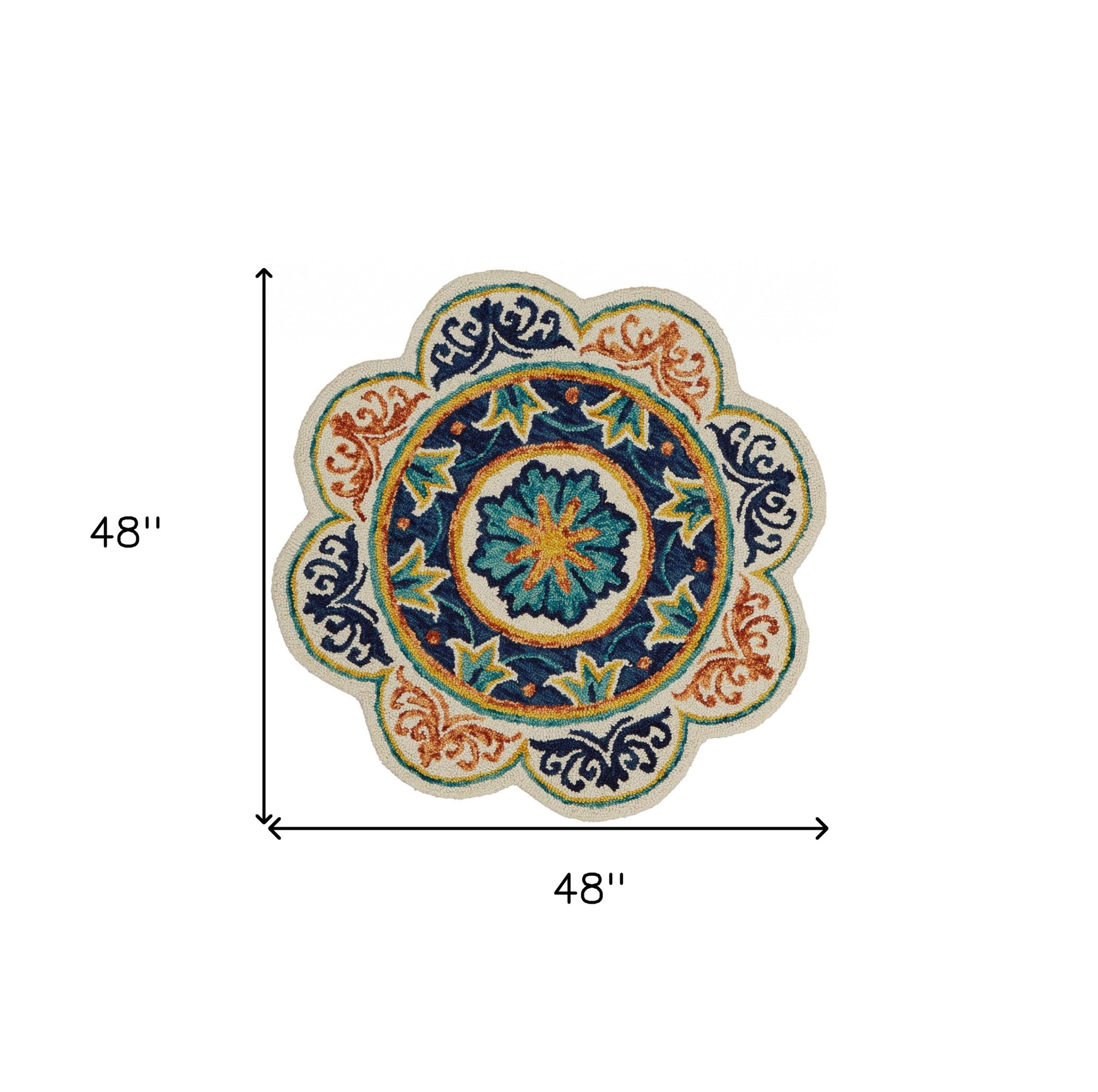 Stand out of the ordinary with this exquisite Round Ivory and Navy Decorative Area Rug on the floor that features a vivacious color palette to spruce up any part of your home. The explosion of colors in the center with details of floral artwork in navy, ivory, and yellow is ornated by the alternate navy and orange filigree on the petal-shaped edges for visual allure. This rug is hand-tufted with 100 % virgin wool to ensure durability and significant insulating property to serve well in both cold and warm conditions. Ideal for areas with high foot traffic, the smooth and low pile construction provides a lustrous surface texture, making it easy to clean and maintain while being an excellent accent on the floor. To give your living space a sense of joy and cheerfulness, this area rug is just the perfect pick to serve you right. 48”