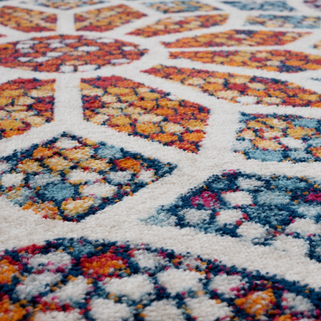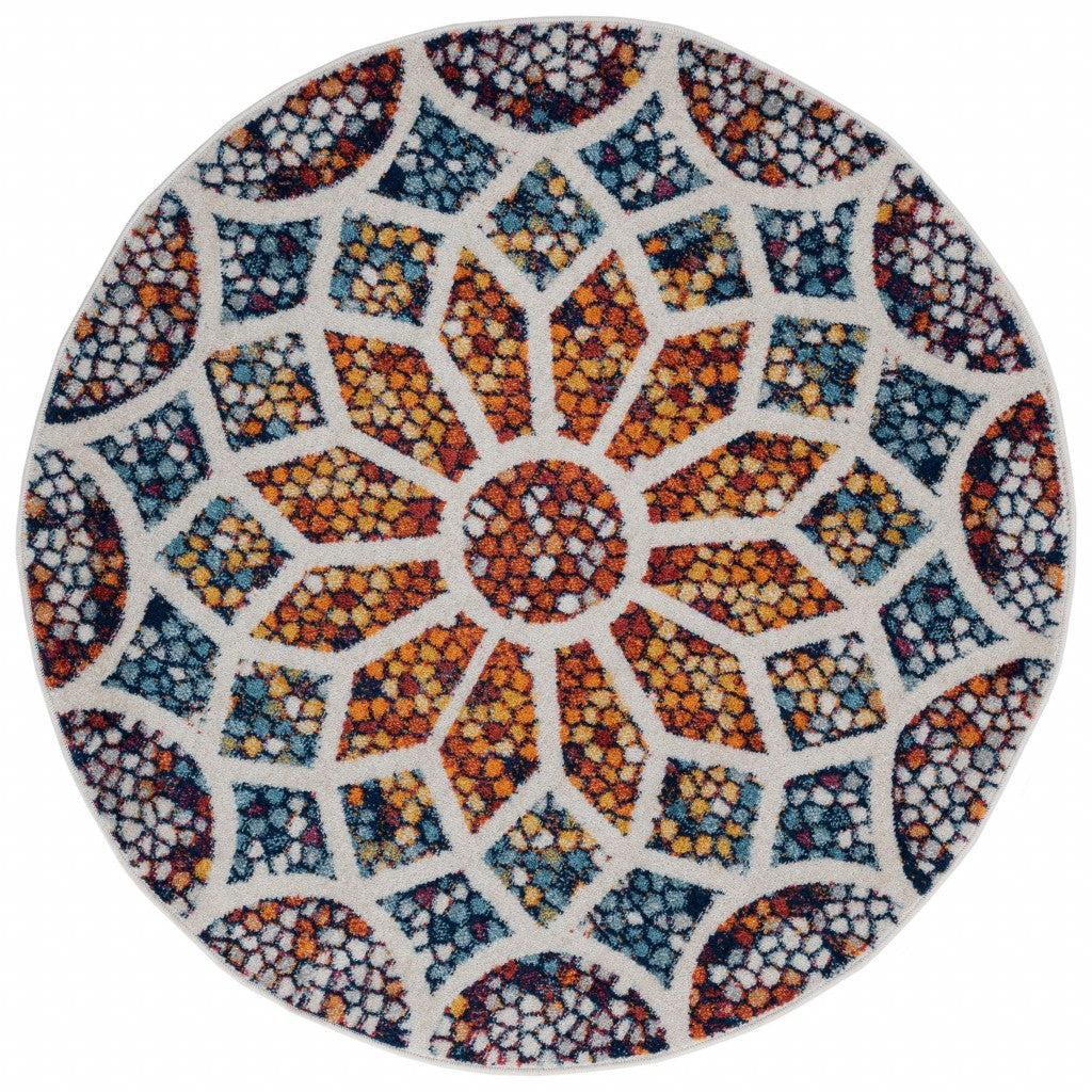 Adorn your living space with this mesmerizing Round Multicolored Floral Mosaic Area Rug that is brimming with cool and warm tones to uplift the ambiance of your home. Combining a palette full of playful and peaceful hues in a mosaic patterned base with a white floral mandala on top to allure the gaze. Machine-made in Turkey with polypropylene fibers that speak of its durability to last for ages and resist stains to keep its shine and gloss. With a medium pile construction, this rug ensures a soft hand with a smooth surface texture for a cozy underfoot that is easy to clean and maintain. Bring home this stunning area rug to add colors to the bare floors and induce a playful ambiance into your space. 52”