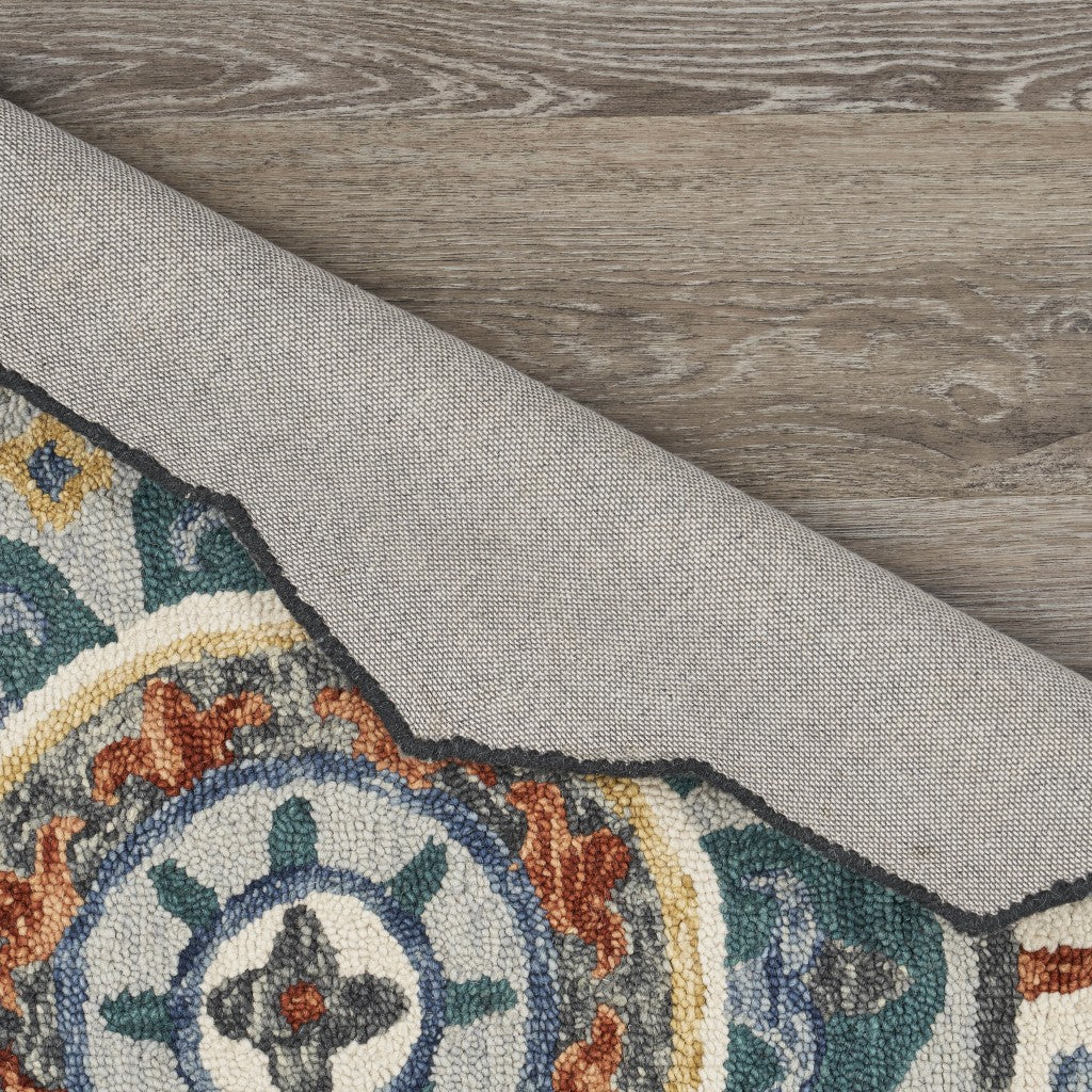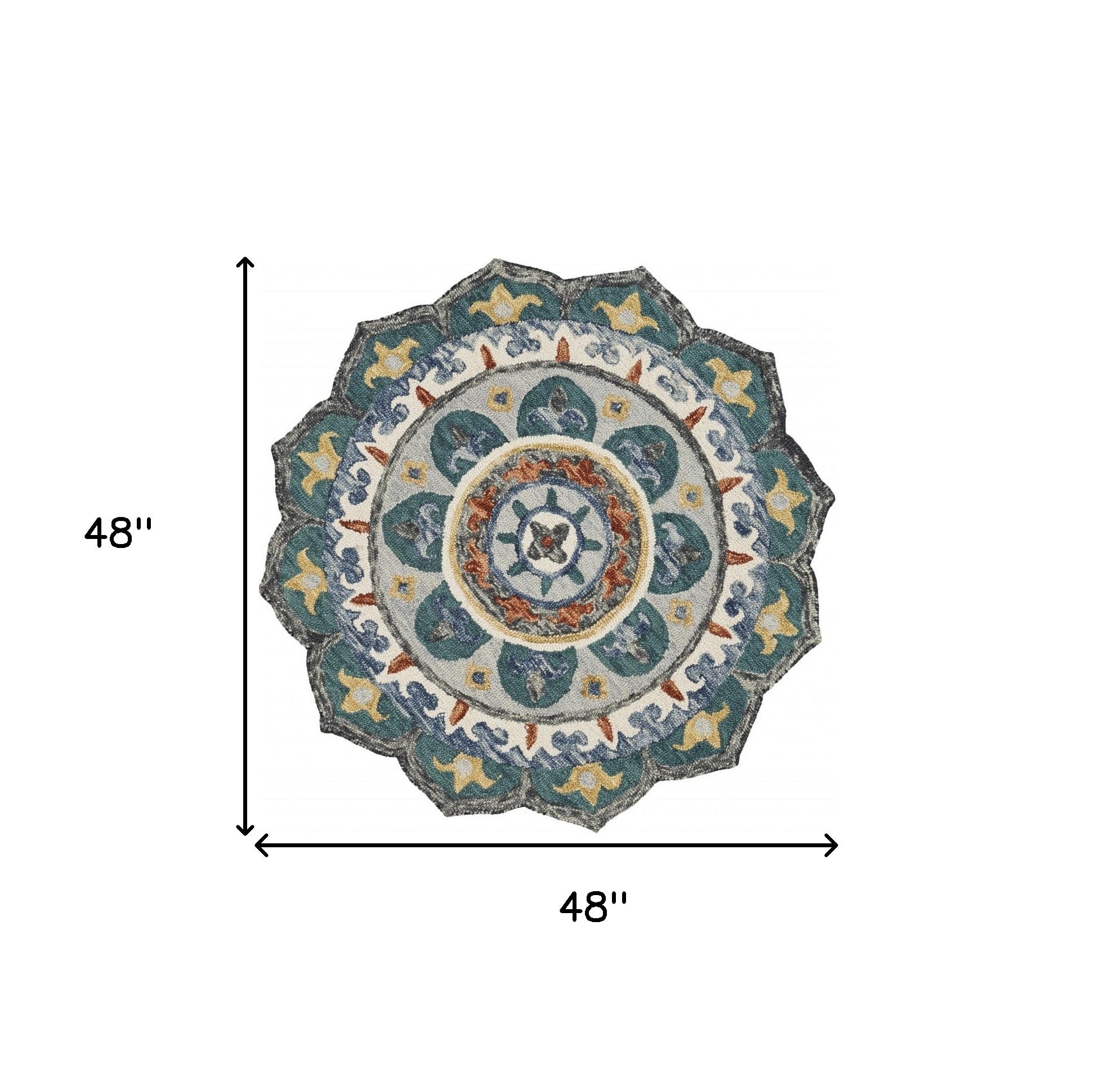 Resembling a freshly painted piece of artwork, this Round Teal Decorative Floral Area Rug will stand out in any interior setting and make the guests turn heads. The saturated shades of teal, blue, white, and pale yellow are flaunted in a beautifully designed floral mandala with petaled edges to make this piece even more captivating. . Standing the test of fashion and function, this rug is hand-tufted with 100% wool to ensure durability and considerable insulating property. The medium pile construction offers a soft and plush surface texture making it easy to clean while being an excellent option for moderate-traffic areas at home or office. The cool-toned hues of the spectrum are gorgeously presented in this area rug to spruce up any modern or traditional interior. 48”