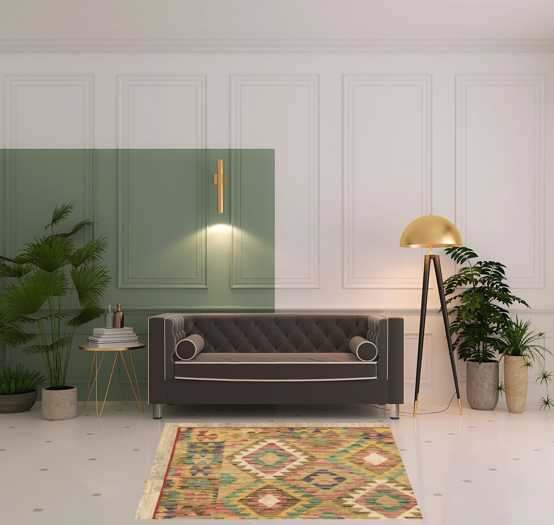 Add great coloration and comfortable texture to your space with this 4' x 6' gold orange brown red green purple and beige southwestern printed stain resistant non skid area rug. This rectangle shaped rug features a southwestern design in gold orange brown red green purple and beige to give it visual interest. A classic shape marries with good looking design for your space Ideal for spaces with kids and pets, this rug is stain resistant to help repel stains and spilled liquids. Area Rugs help to give warmth and sense of home to your space. 0.12" H x 42.13" W x 66.14" D