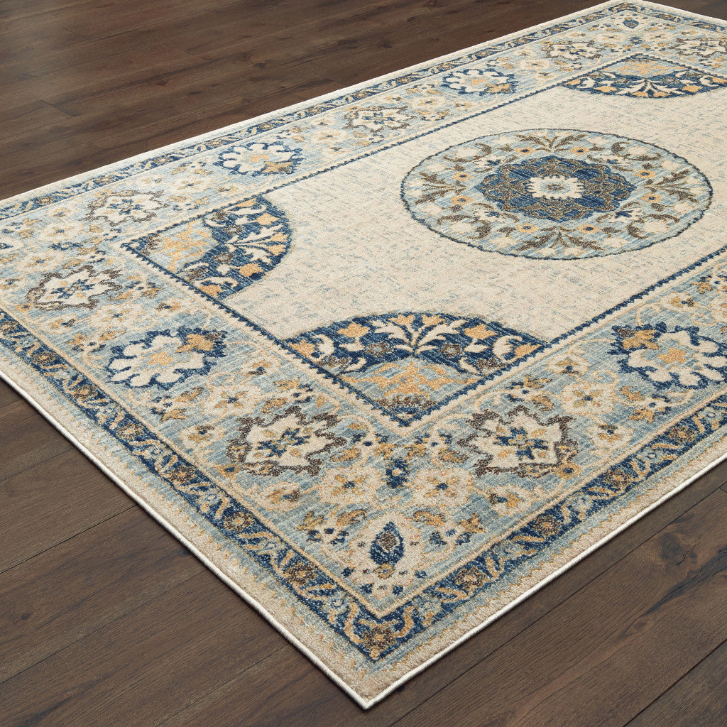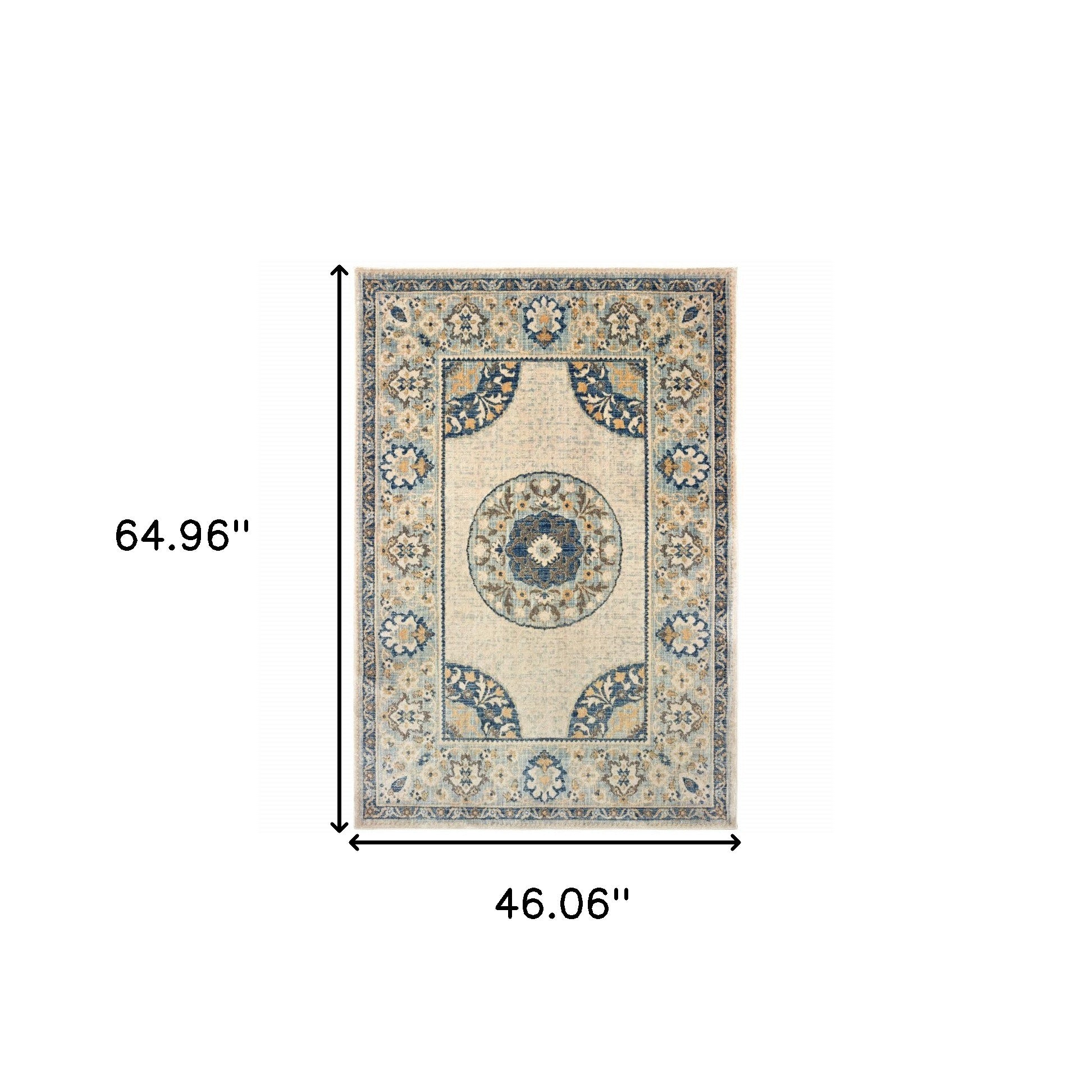 4' X 6' Ivory And Blue Oriental Power Loom Stain Resistant Area Rug