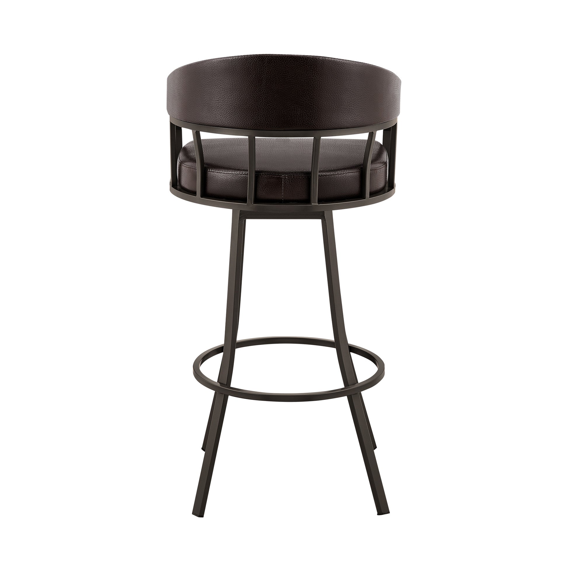 With this 40" brown faux leather and iron swivel low back bar height chair you can add design and extra seating to your space. A java brown iron frame is finished off with a brown faux leather seat that is the epitome of quality construction and design. A low back mixed with a round shaped seat design makes this chair both comfortable and fashionable. The armchair design gives you a great place to comfortably rest your arms. 40" H x 21" W x 21" D