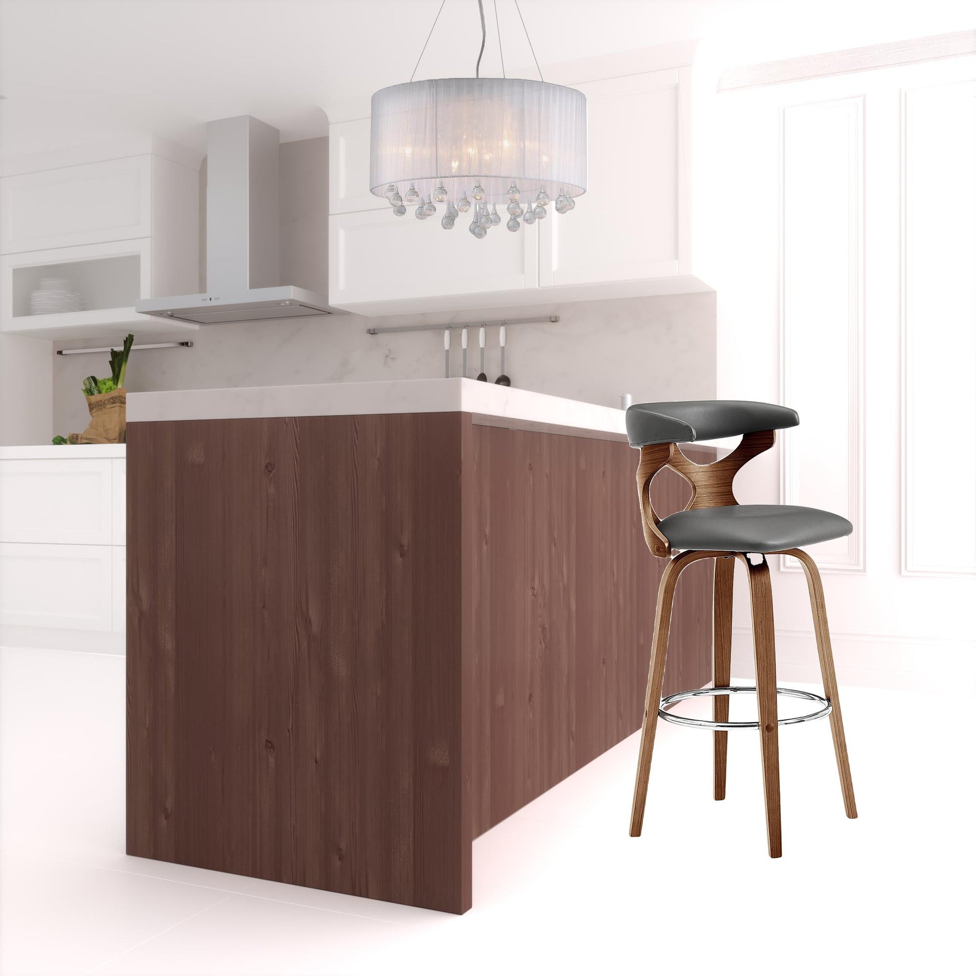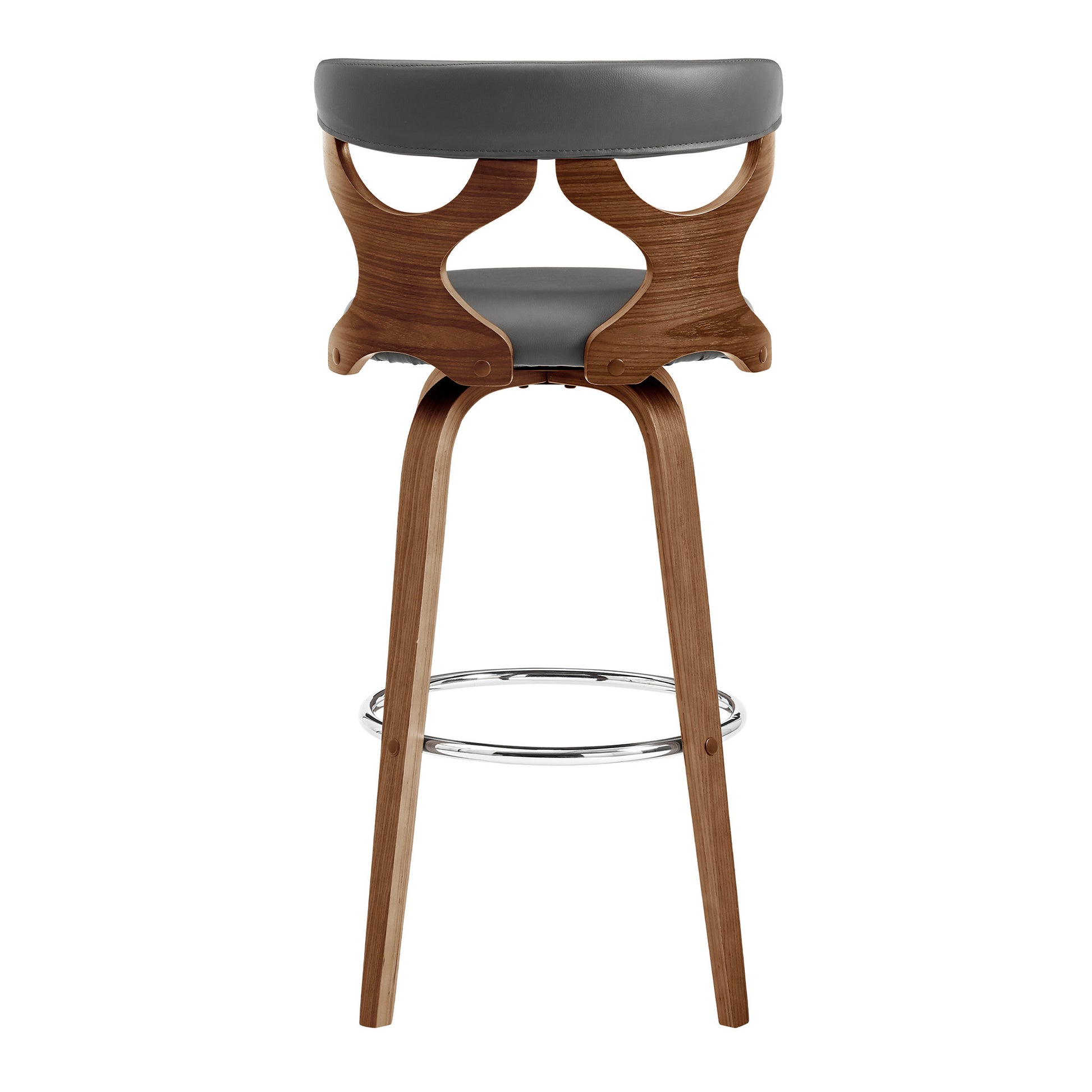 Comfort and design come together nicely in this 40" gray faux leather and manufactured wood swivel bar height chair. The walnut coloration of the high quality manufactured wood base marries nicely with the gray faux leather seat. The round shape of the seat combines with a full back to give this chair a comfortable and fashionable look. A great seating option, this stool will bring a unique look to any room. 40" H x 20" W x 19" D