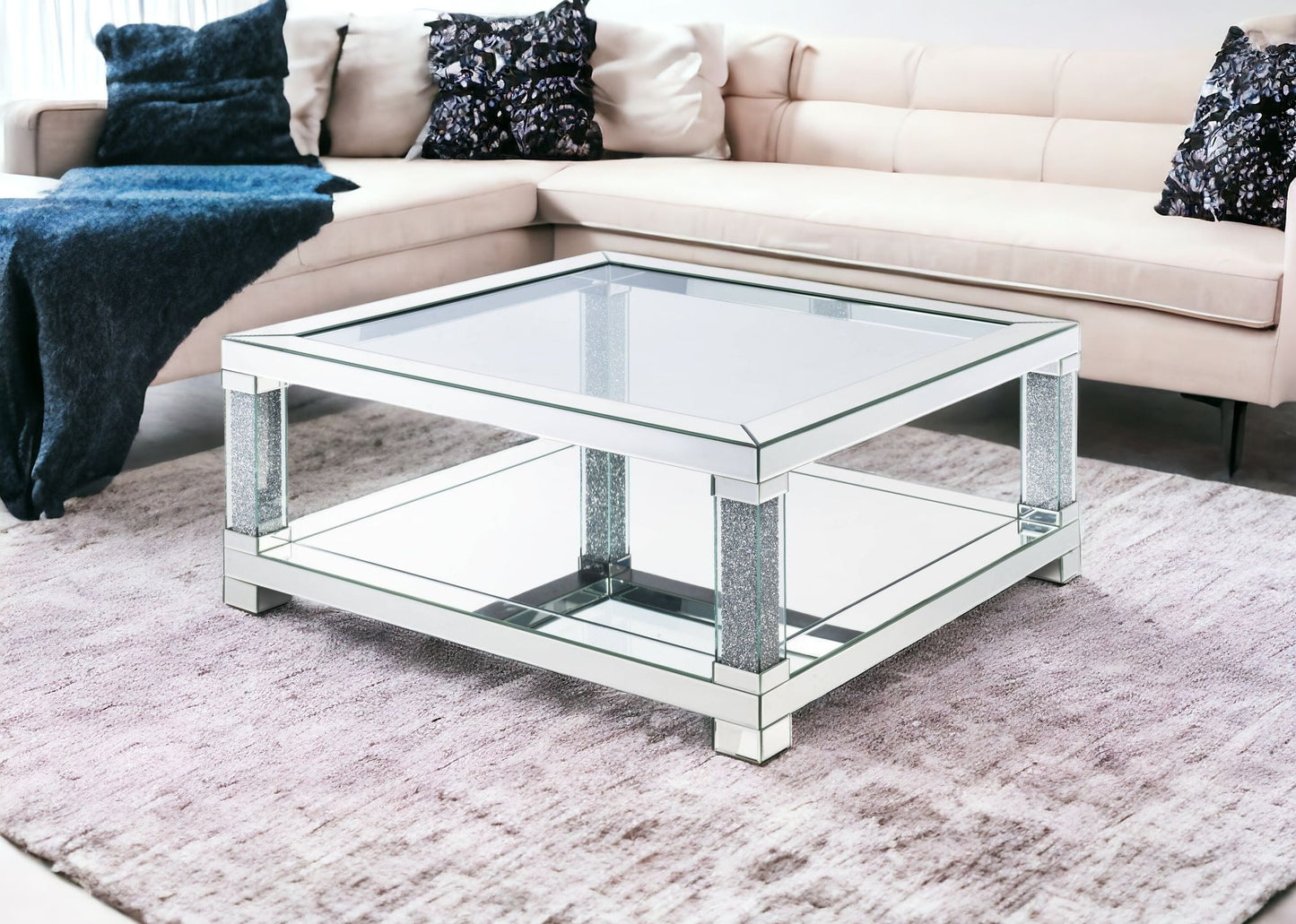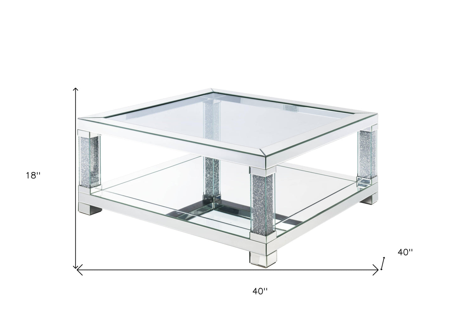 40" Clear And Silver Glass Square Mirrored Coffee Table With Shelf