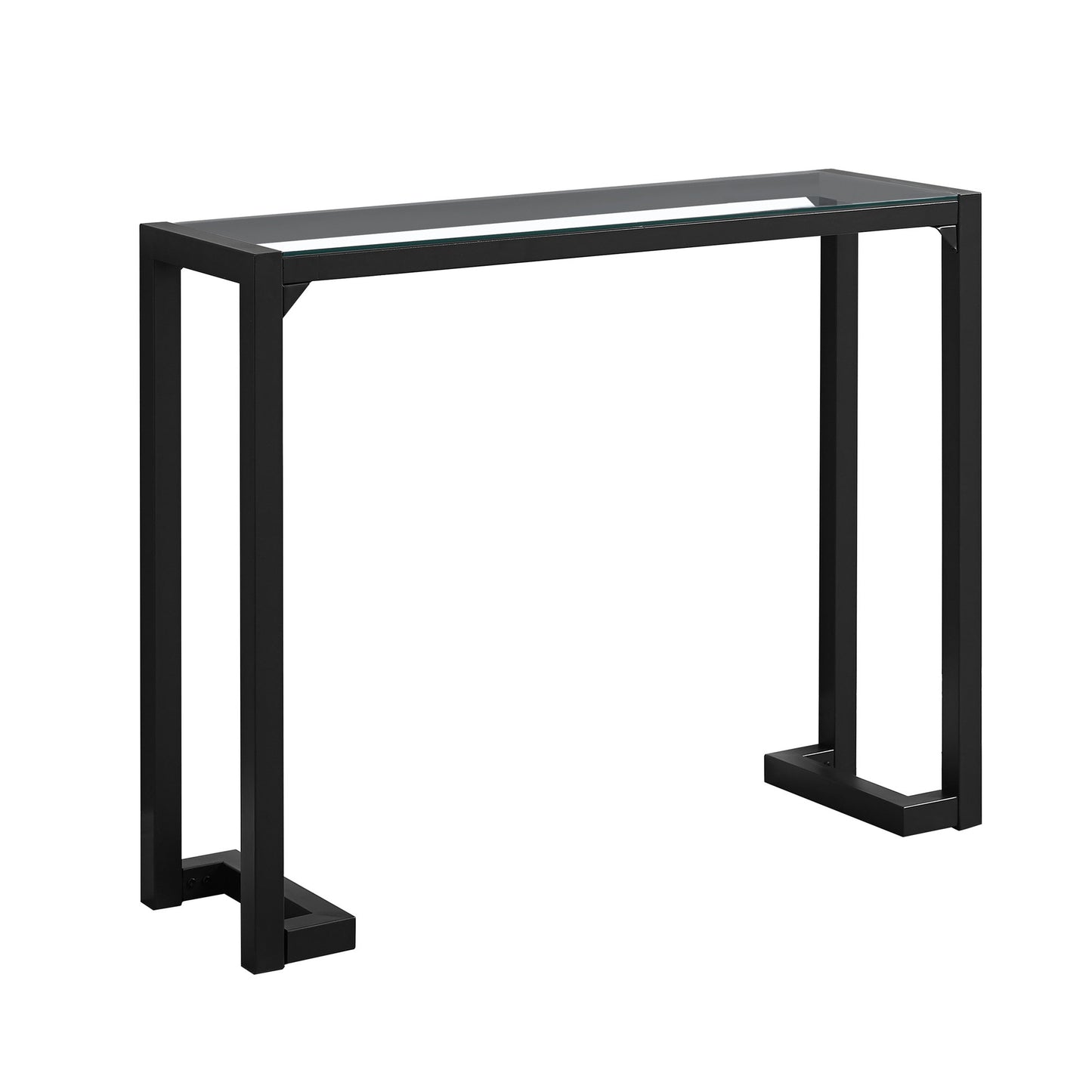 This 42-inch clear and black glass console table can provide a variety of practical functions such as providing extra storage space, serving as a display area for decorative items or acting as a catch-all for keys, mail, and other small items. This rectangular table is ideal for up against the wall, can free stand in a room, or sit behind the sofa perfectly. Despite its luxurious appearance, the clear glass top is easy to maintain and clean, making it a practical option for those seeking both style and functionality. Ideal for living rooms, bedrooms, home offices, and lounge areas, this console table is not only good looking but multi-functional and practical addition to your space. 32-inch H x 42-inch W x 12-inch D