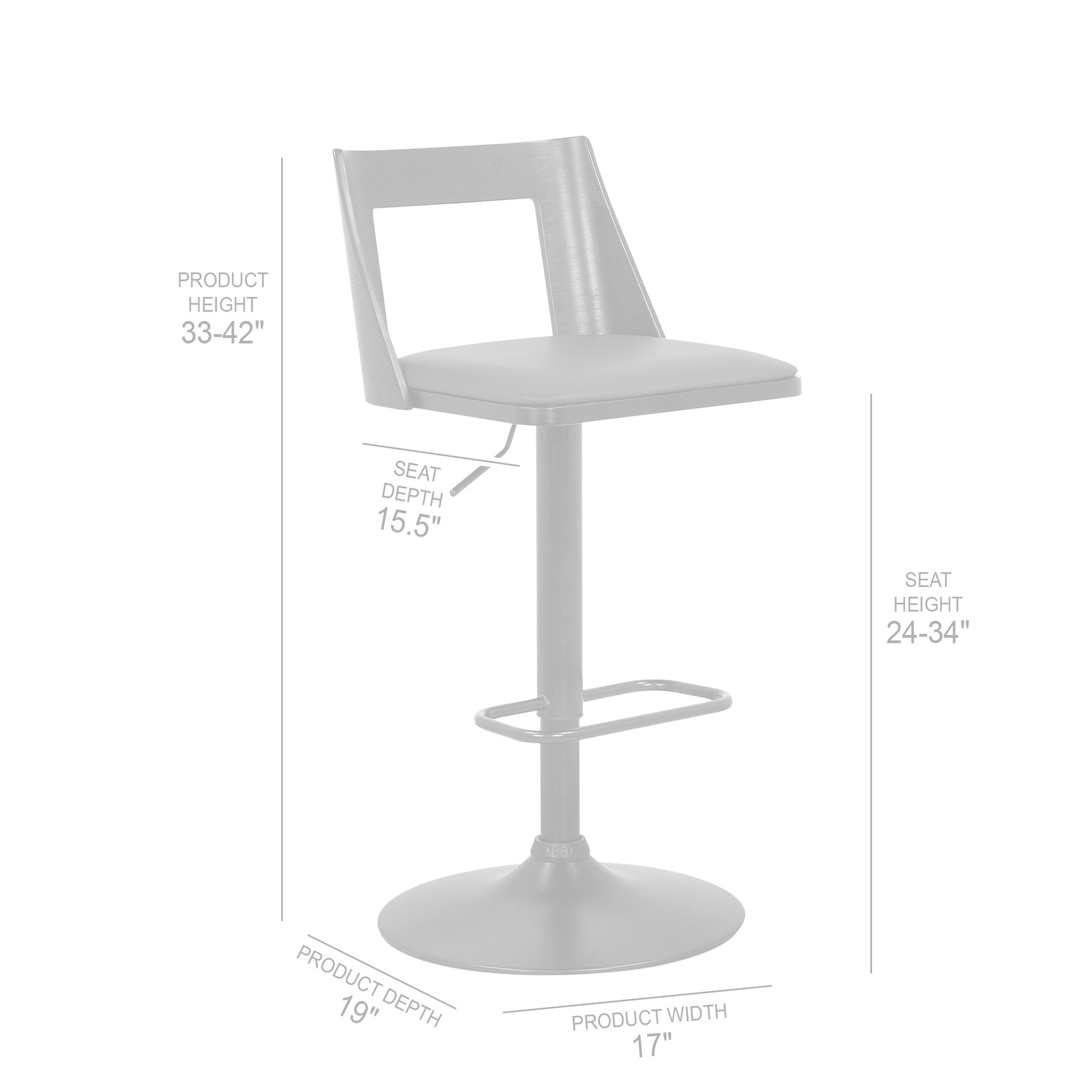 This 42" gray and black faux leather swivel adjustable height bar chair with footrest will be the perfect way to add some cool design and utility to your space similar to what you find in your favorite cafes or pubs. A black iron frame is finished off with a gray faux leather seat that is the epitome of quality construction and design. Not only good looking and stylish, this chair features a round shaped seat and a full back for the ultimate in comfort and enjoyment. Designed with a footrest for comfort and convenience. 42" H x 17" W x 19" D