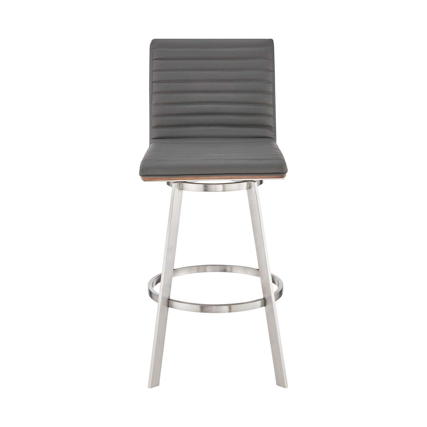 This 42" gray faux leather and iron swivel bar height chair will be the perfect way to add some cool design and utility to your space similar to what you find in your favorite cafes or pubs. Quality construction from brushed stainless steel finishing iron combines with gray faux leather to give this stool a fresh and updated look. Not only good looking and stylish, this chair features a round shaped seat and a full back for the ultimate in comfort and enjoyment. The armchair design gives you a great place to comfortably rest your arms. 42" H x 17" W x 21" D