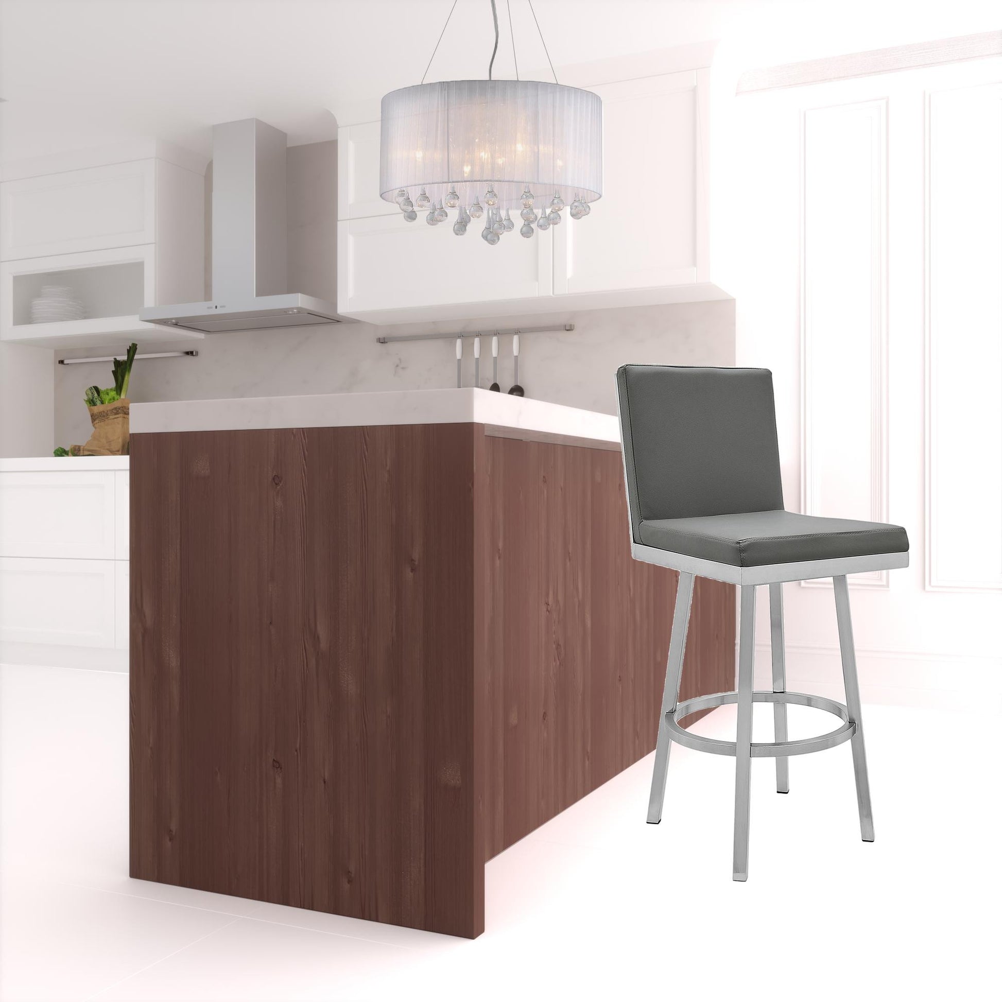 The perfect way to add some extra seating in your home, this 44" gray faux leather and iron swivel bar height chair will elevate the look and vibe of your room. Quality construction from brushed stainless steel finishing iron combines with gray faux leather to give this stool a fresh and updated look. The round shape of the seat combines with a full back to give this chair a comfortable and fashionable look. A great seating option, this stool will bring a unique look to any room. 44" H x 19" W x 23" D